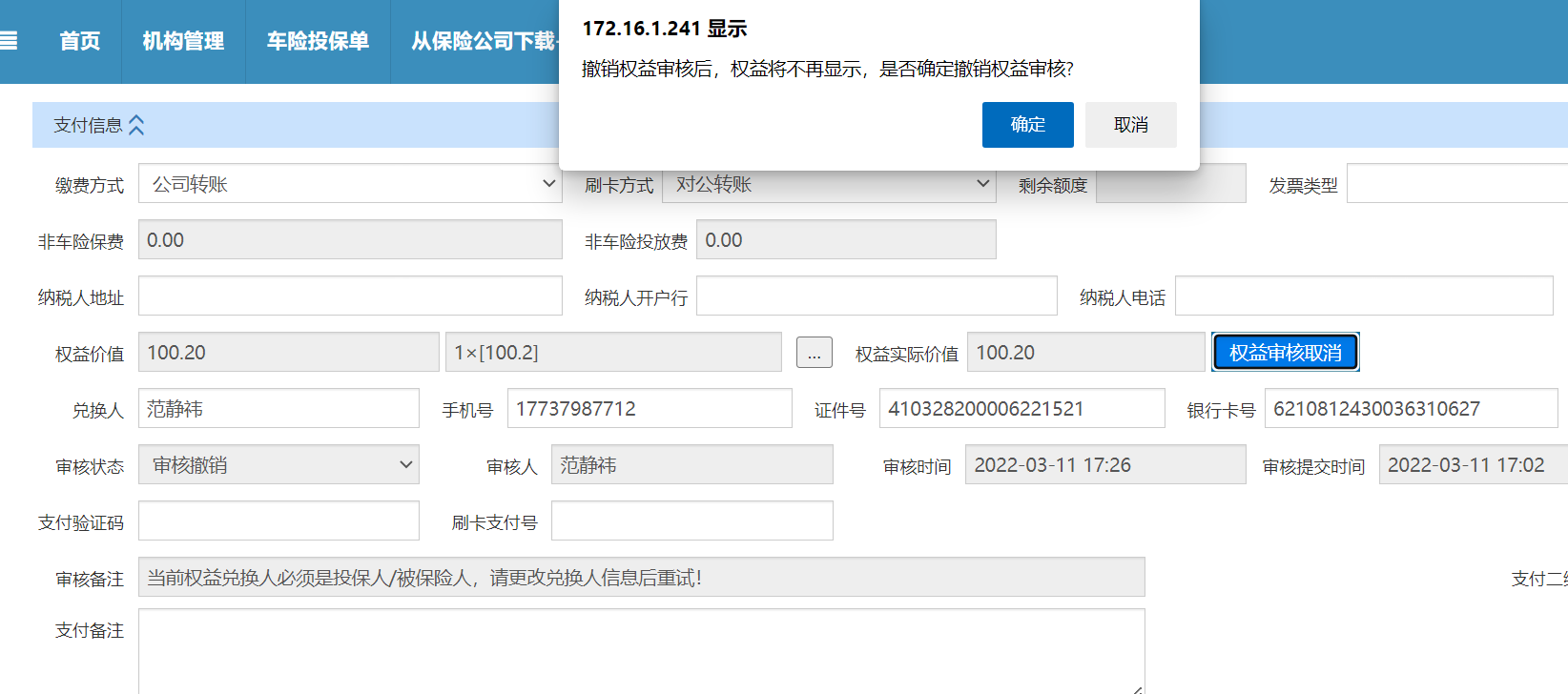取消权益审核按钮失效,点击后无法进行权益审核撤销机构名称:郑州服务器 世纪经开车牌号:豫A8NH73