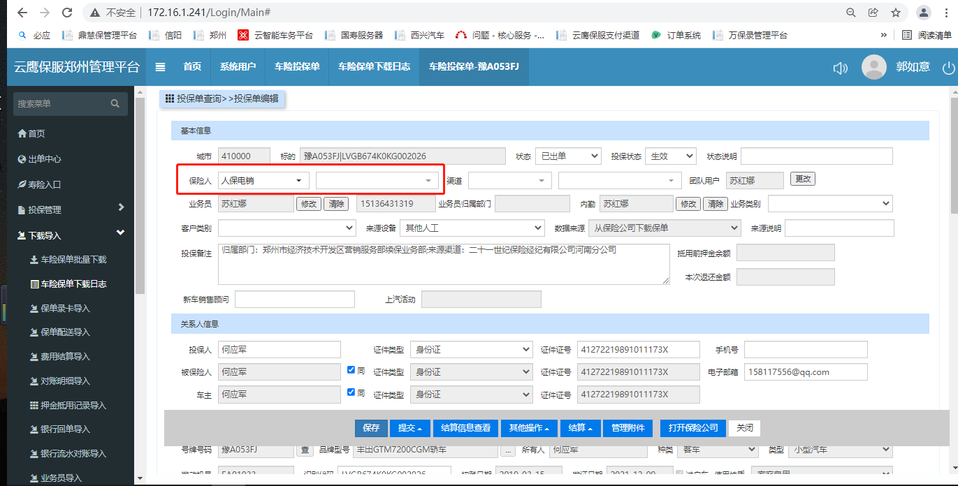郑州服务器下,世纪经开机构,坐席通过【车险投保单->从保险公司下载-保单】处成功下载保单之后,取消审核后无法重新审核生成流水,原因为保险人出的保险公司为空(详情见截图)经开区车牌号:豫A053FJ,下载日期2021.12.12