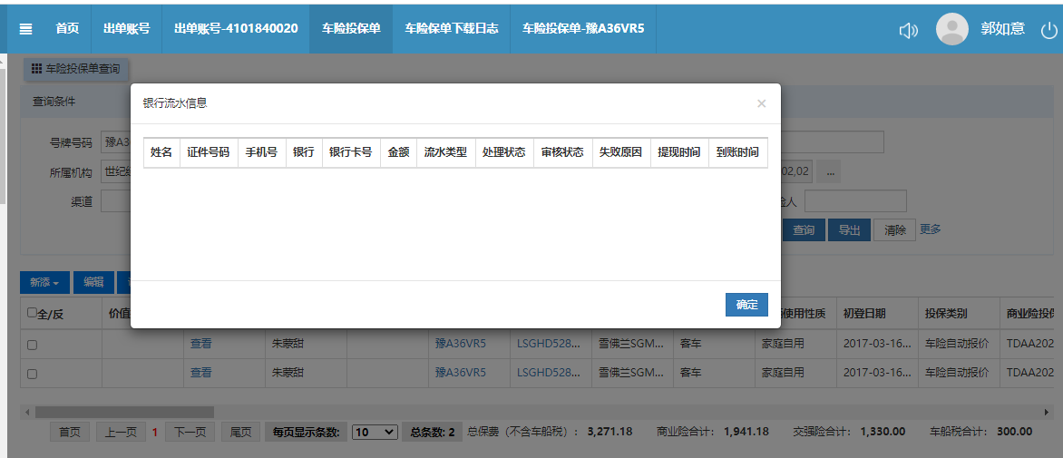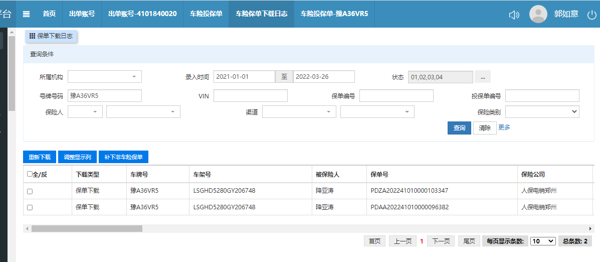 郑州服务器下的世纪经开机构,投保单以及保单作废之后(未生成结算单),坐席重新下载录入到系统中,投保单已经重新录入,可以在系统查询到,但是未生成流水,下载日志中查询并未查询到对应车牌号的下载日志 问题车辆:豫A36VR5