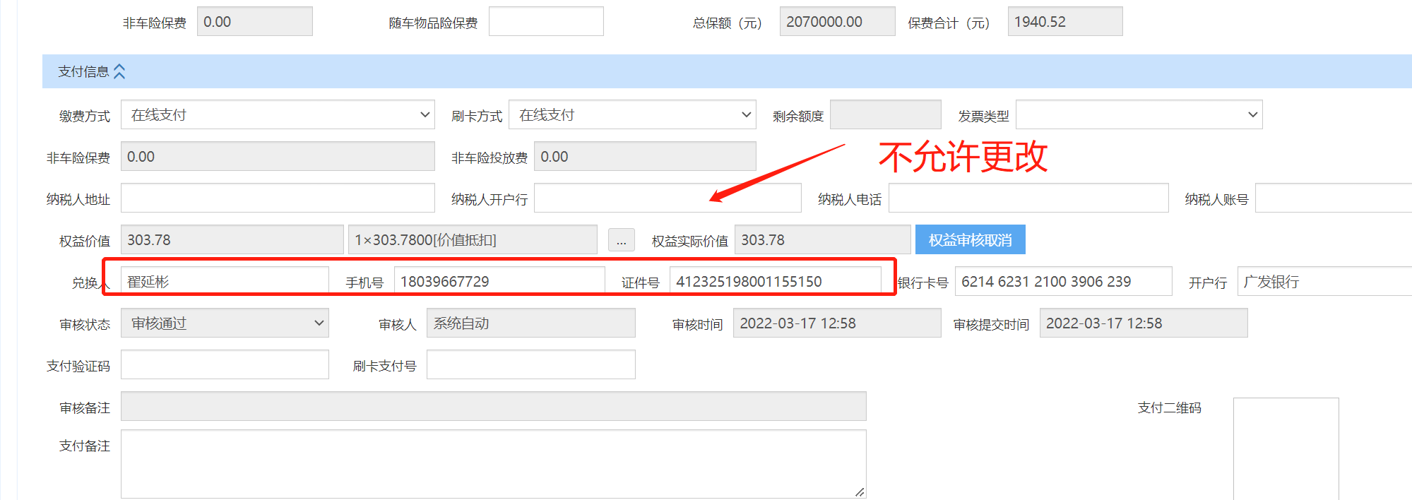 转账失败后坐席修改支付方式重新支付时,若该机构勾选了收款人必须是投被保险人,则在投保单修改支付方式重新发起支付时,不允许修改收款人姓名、身份证号、手机号