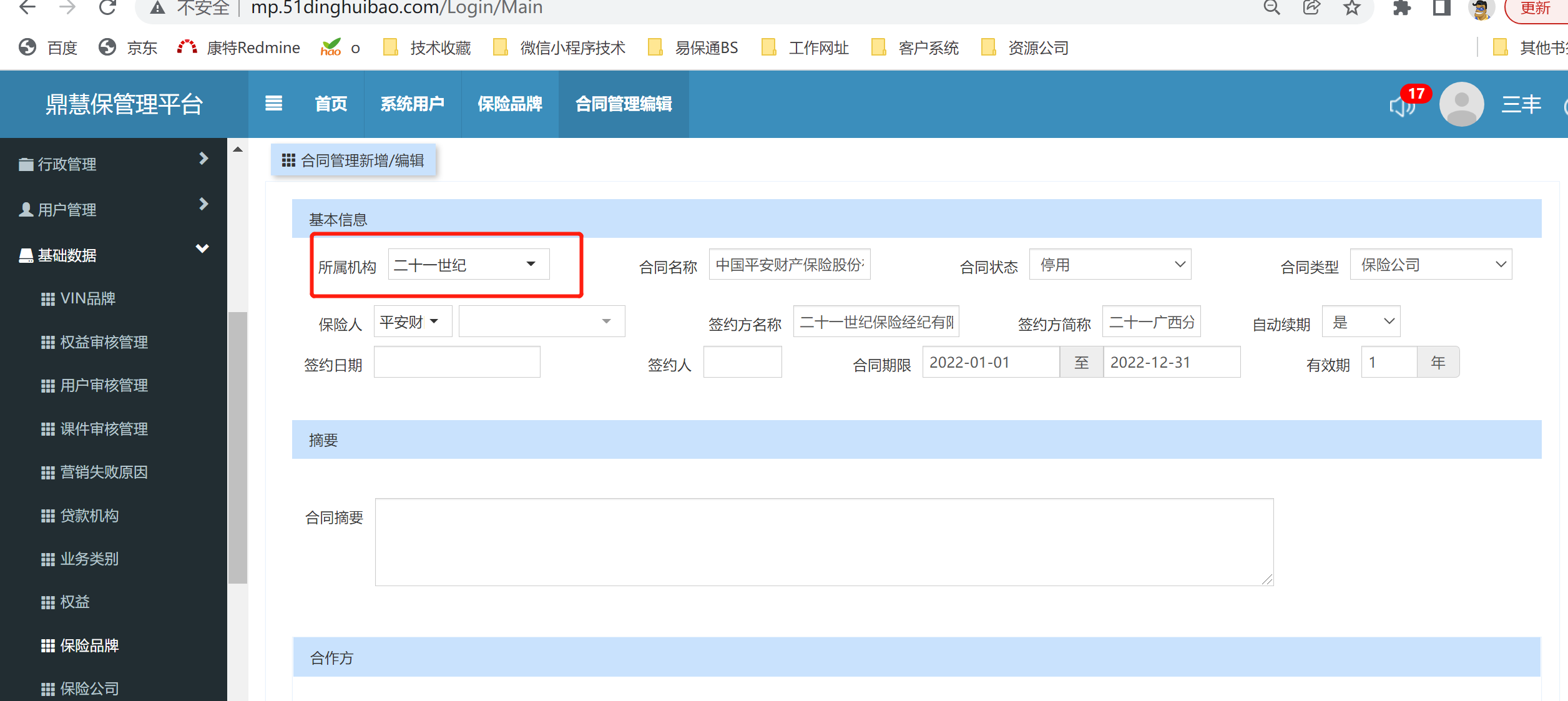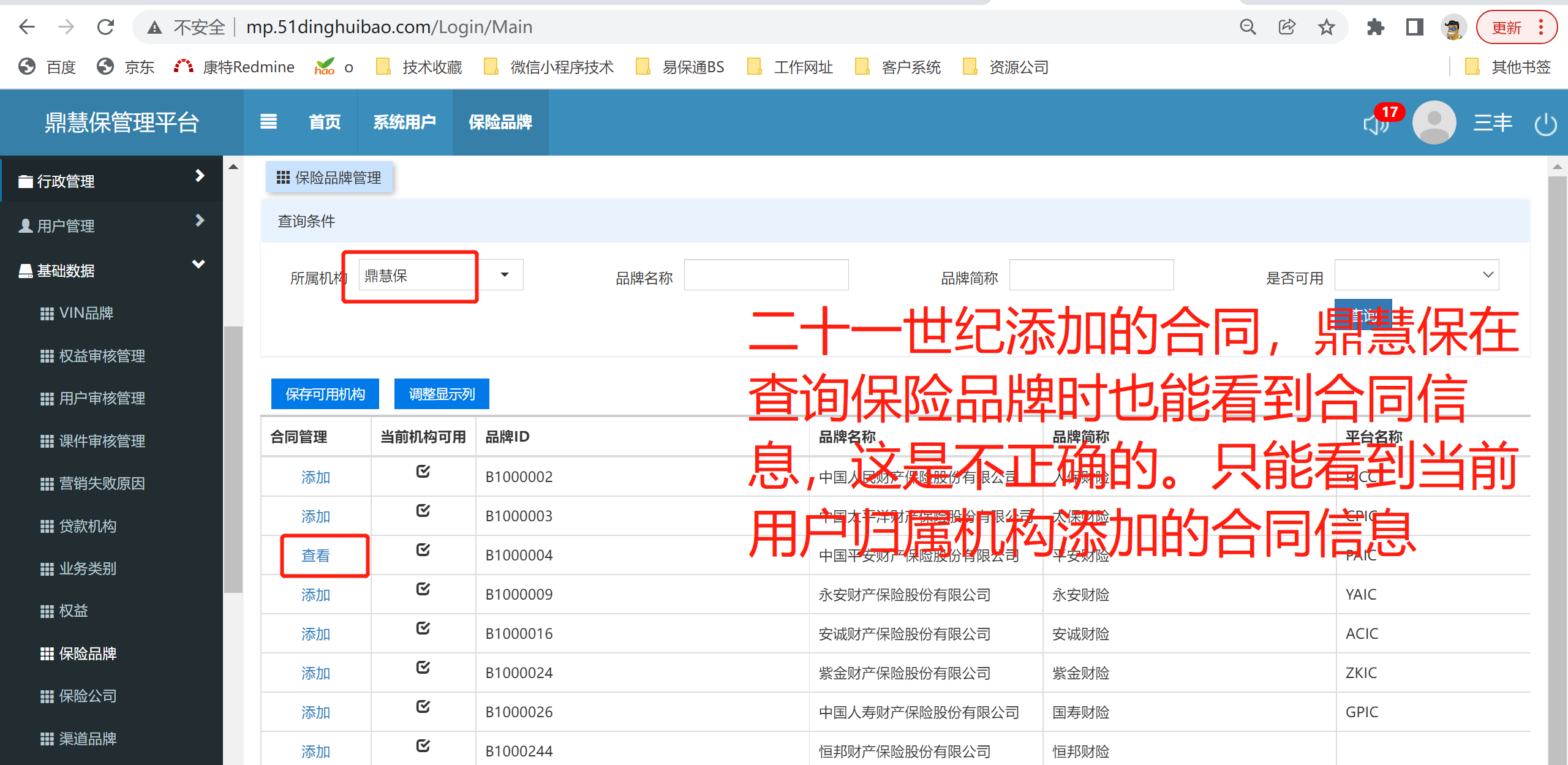 二十一世纪添加的合同,其他机构在查询保险品牌或保险公司时也能查看到此合同。需要修改为只能看当前用户归属机构的合同信息。问题现象见附件。