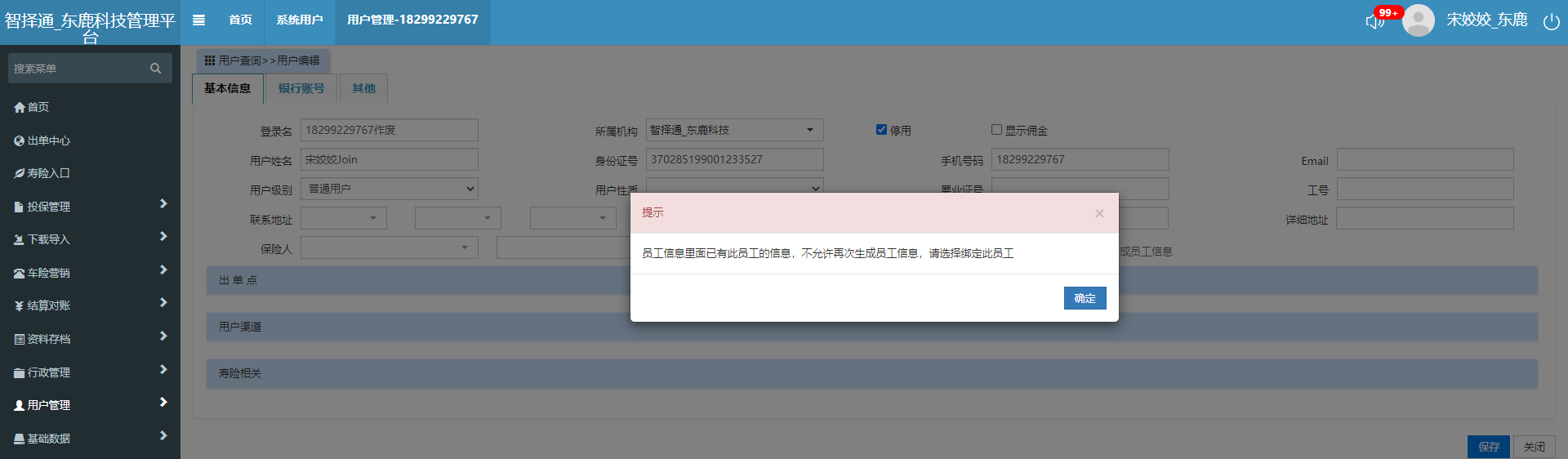 作废系统用户时提示【员工信息里已有此员工信息...】,作废时不应出现此错误。具体错误信息详见附件