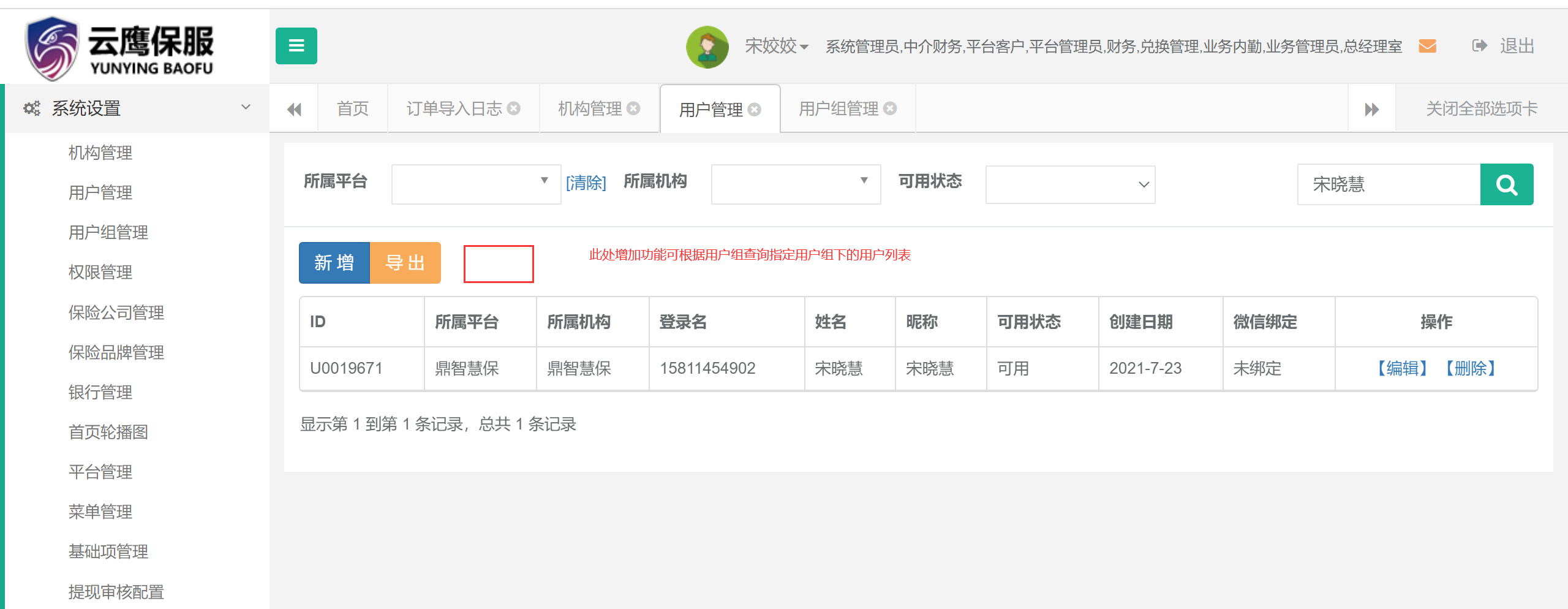 在用户管理里增加功能,可查看指定用户的归属用户组列表。可参考BS管理系统——系统用户——隶属关系功能