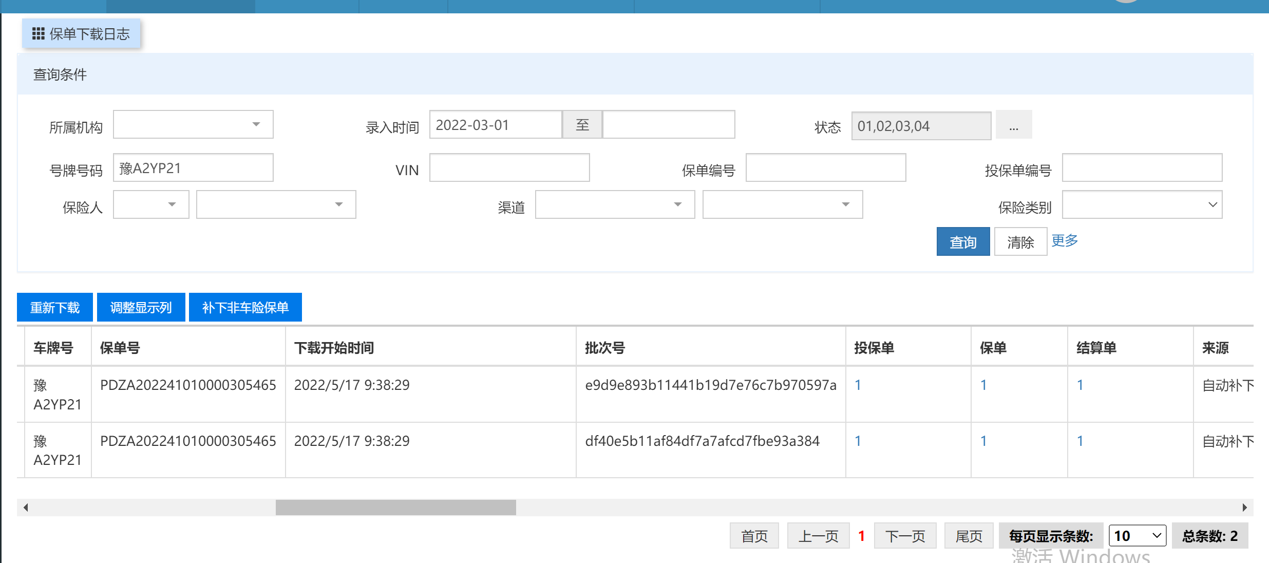 车牌号豫A2YP21,保单号为PDZA202241010000305465,出现同一时间点补下生成了两个投保单