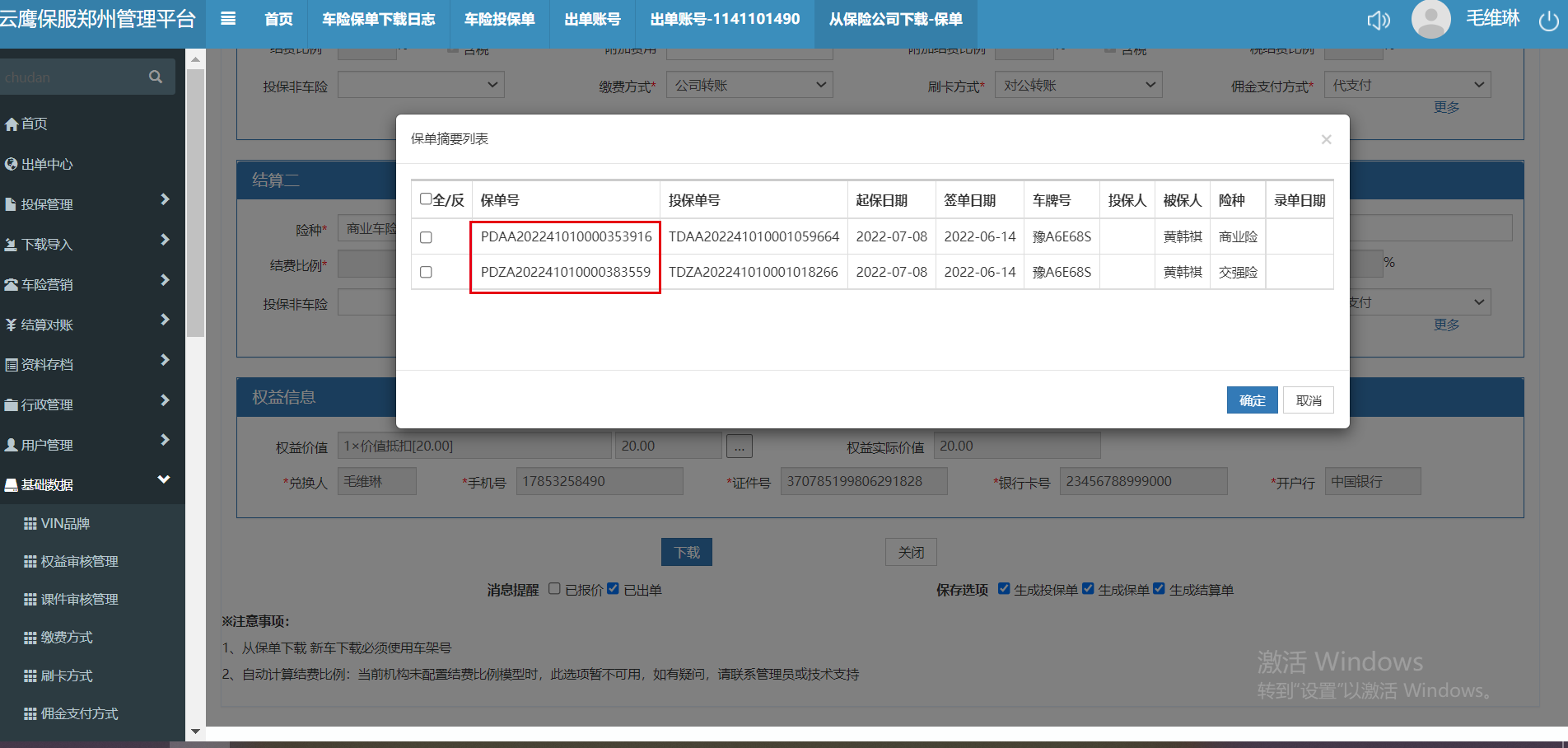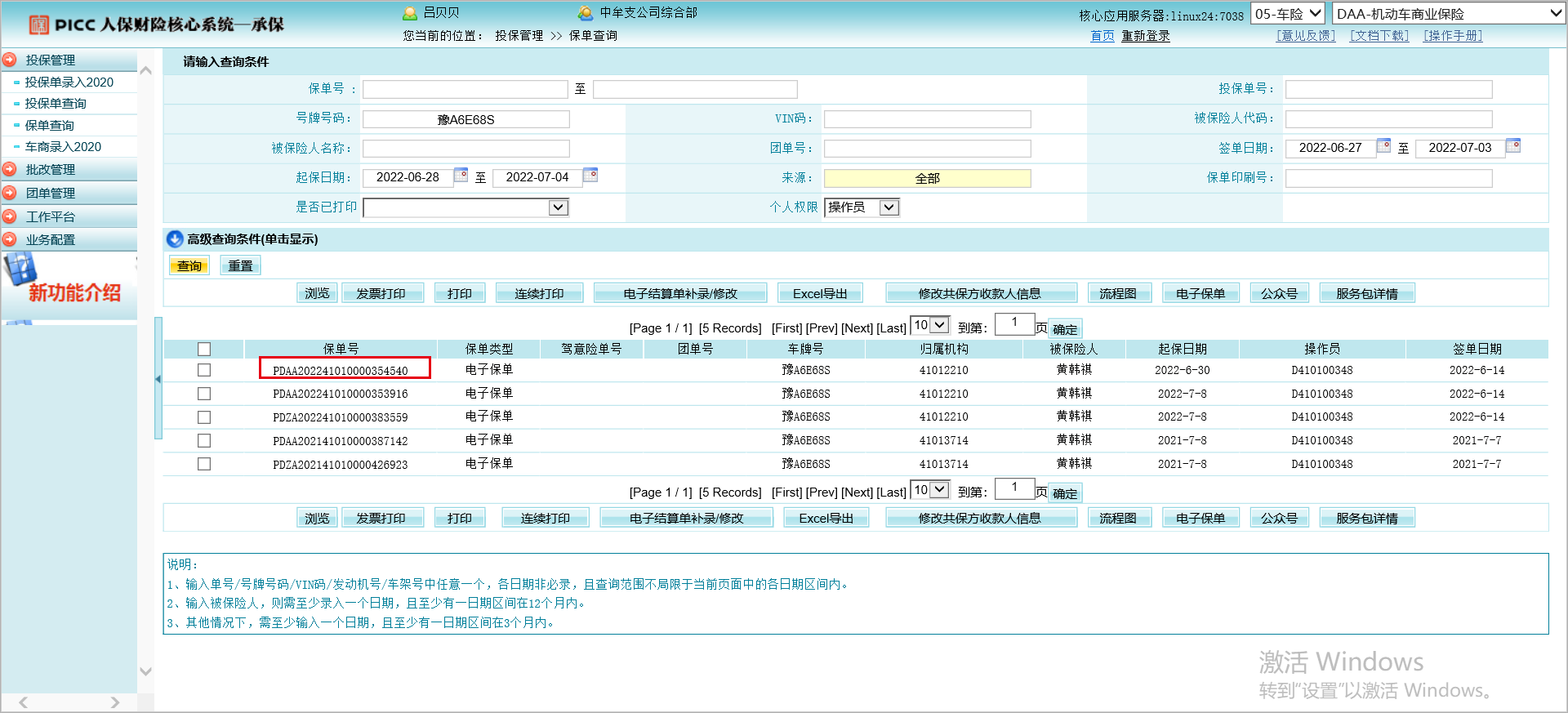 坐席把车辆的商业险退保重出,在系统下载时只能查到旧的商业险保单,查不到新的,到三代系统内查看新保单正常能查询到,现坐席老师无法下载新保单号为PDAA202241010000354540车牌号:豫A6E68S