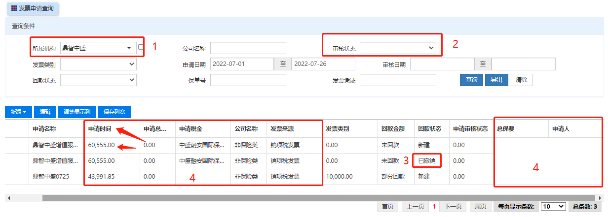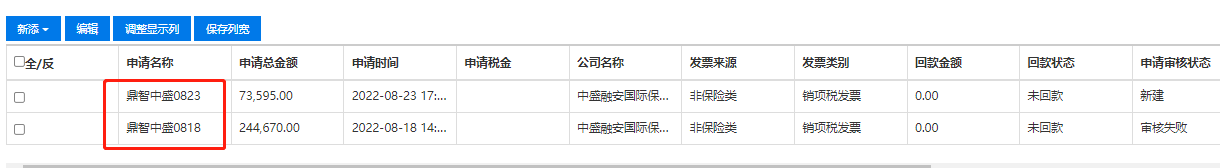 4.调整显示列后未正常显示,请将【申请时间】放在【申请名称】后