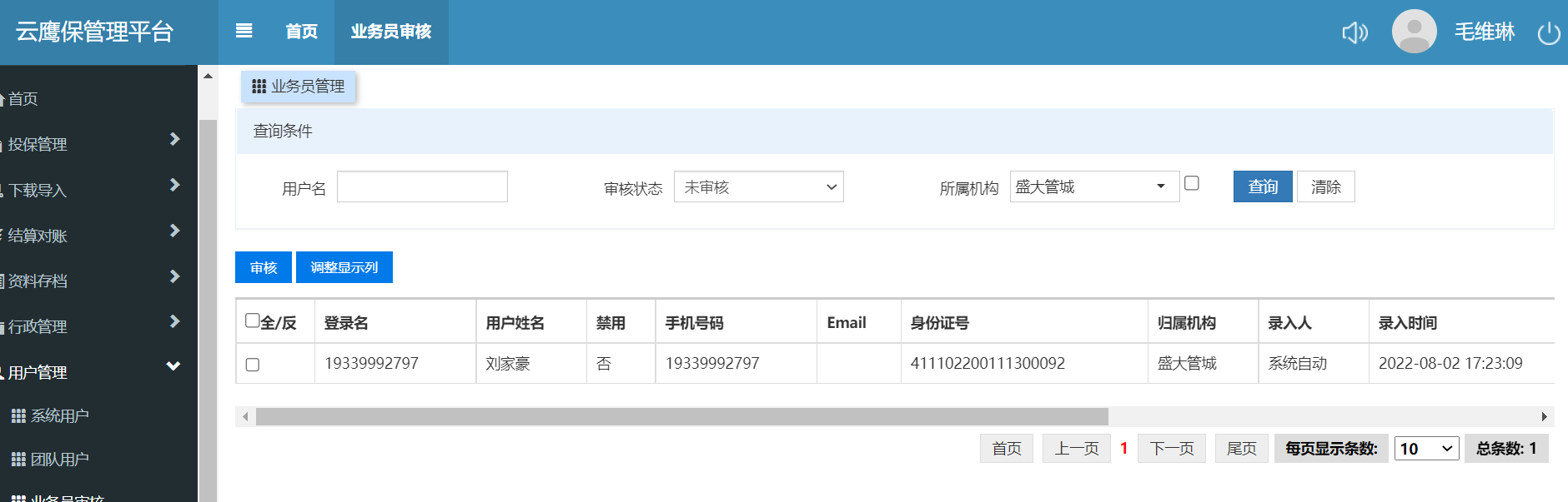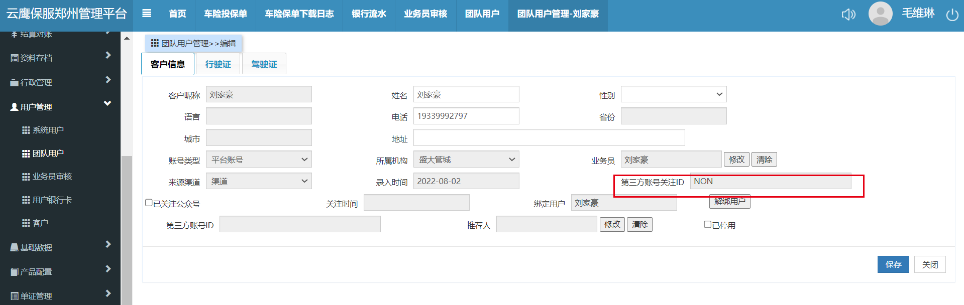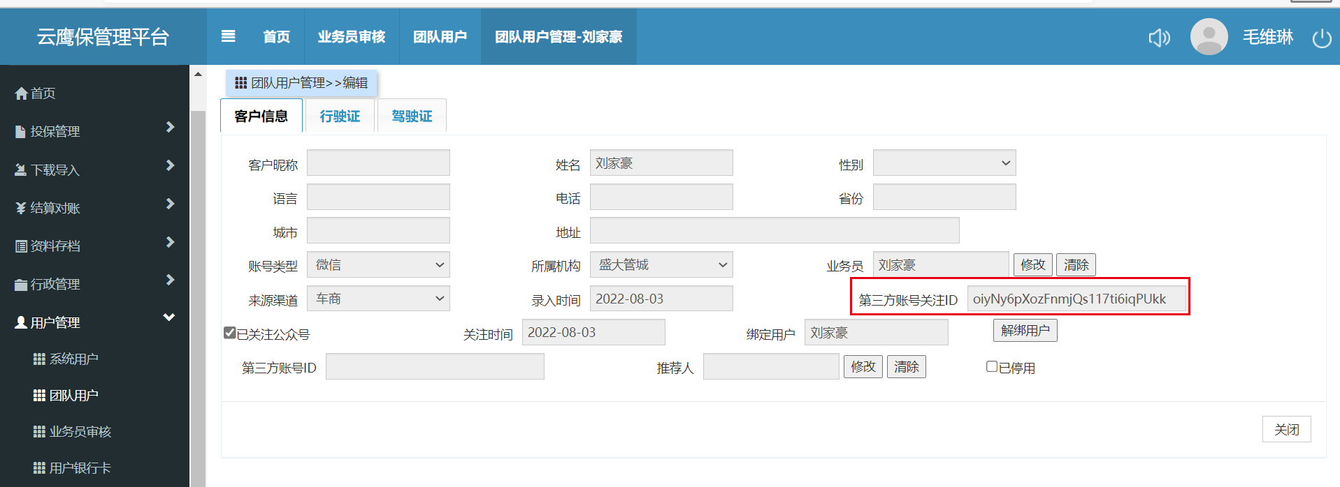 给坐席老师在系统内已添加账号,但是坐席老师进行了一遍成为业务员操作显示待审核,点绑定现有平台账号时显示已绑定,但是在郑州服务器查不到业务员申请,在云鹰保上能查到,但在云鹰保上无法进行审核操作,在郑州服务器操作团队用户解绑显示已解绑但实际未解绑成功,云鹰保上依旧显示绑定且无法操作,现管城老师无法登录系统