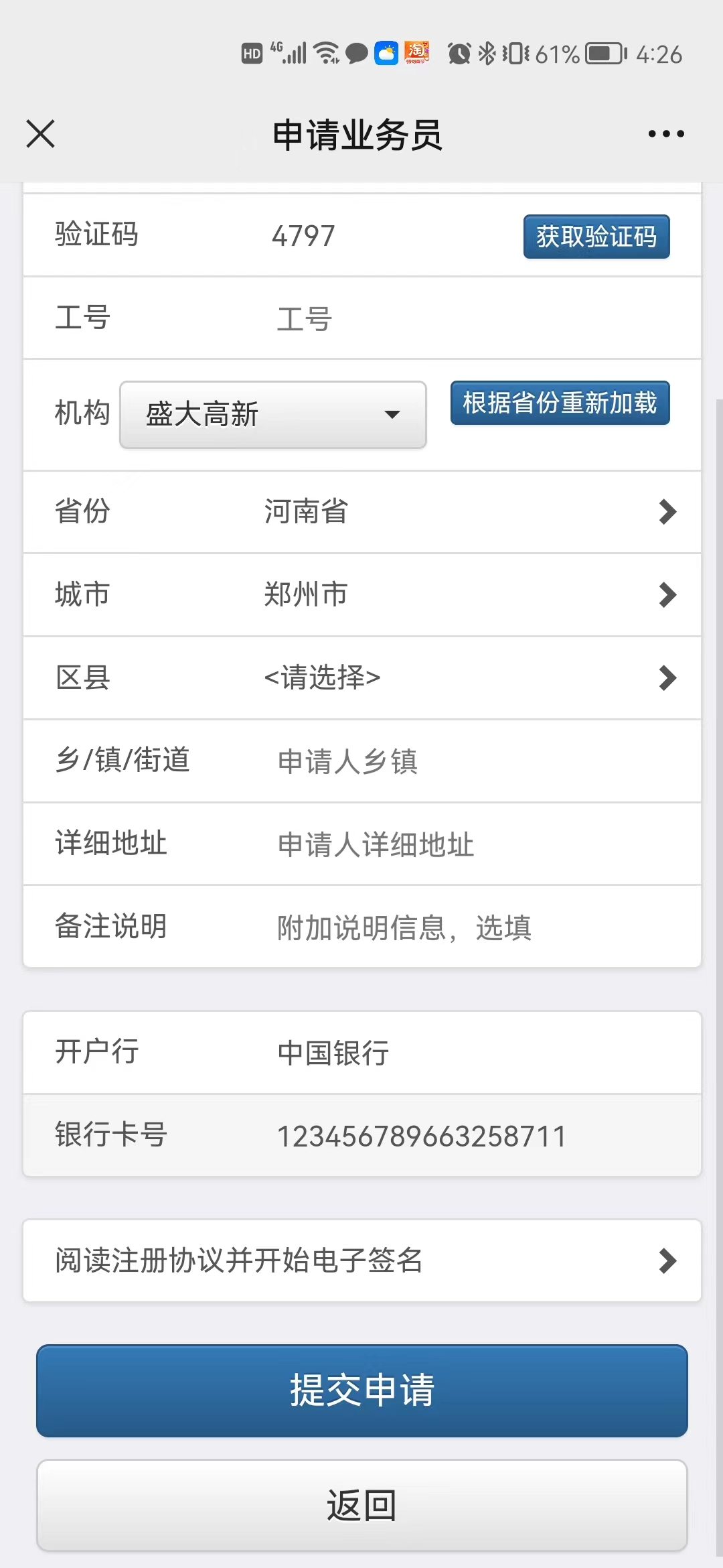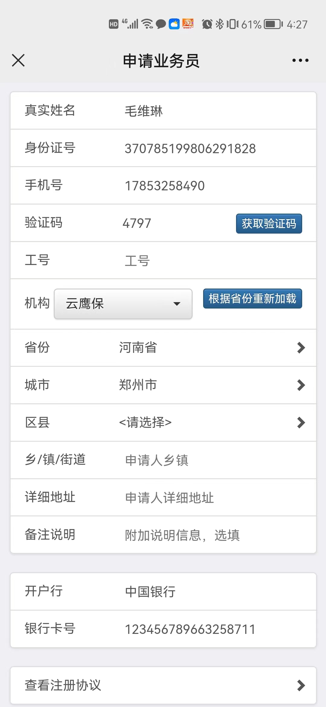 情况一:未扫描机构二维码,在个人中心中点击“申请成为业务员”,选择好机构后,点击签署协议,签署协议回到申请页面时会刷新机构,原先选择好的机构变为“云鹰保”,如果业务员老师没有仔细看就提交的话会绑到“云鹰保”机构