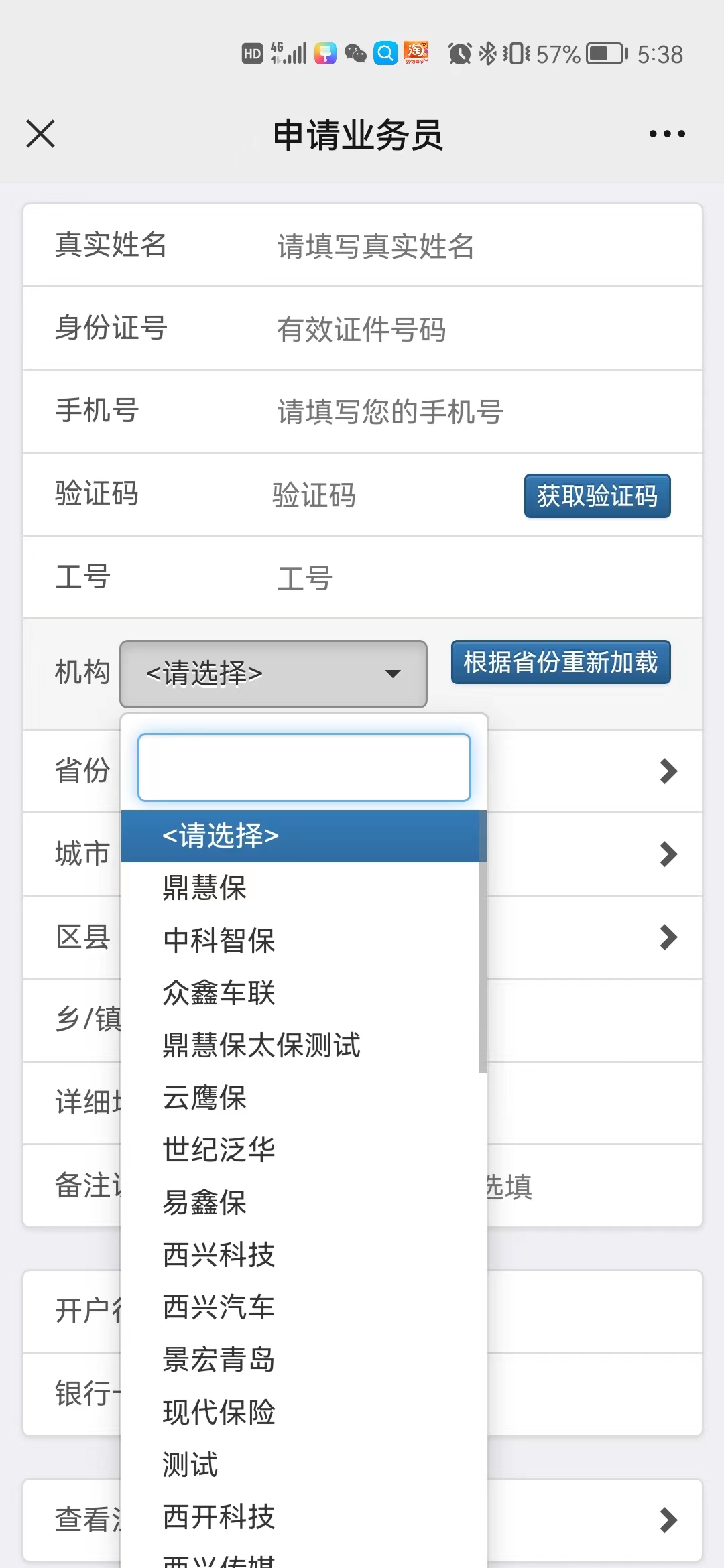 情况二:扫描机构二维码,点击“申请成为业务员”机构处还是可以选择,既然已经扫描了机构二维码就说明他要申请成为此机构的业务员,也就无需选择了,需要修改为点击“申请成为业务员”后机构就定为二维码所属的机构;