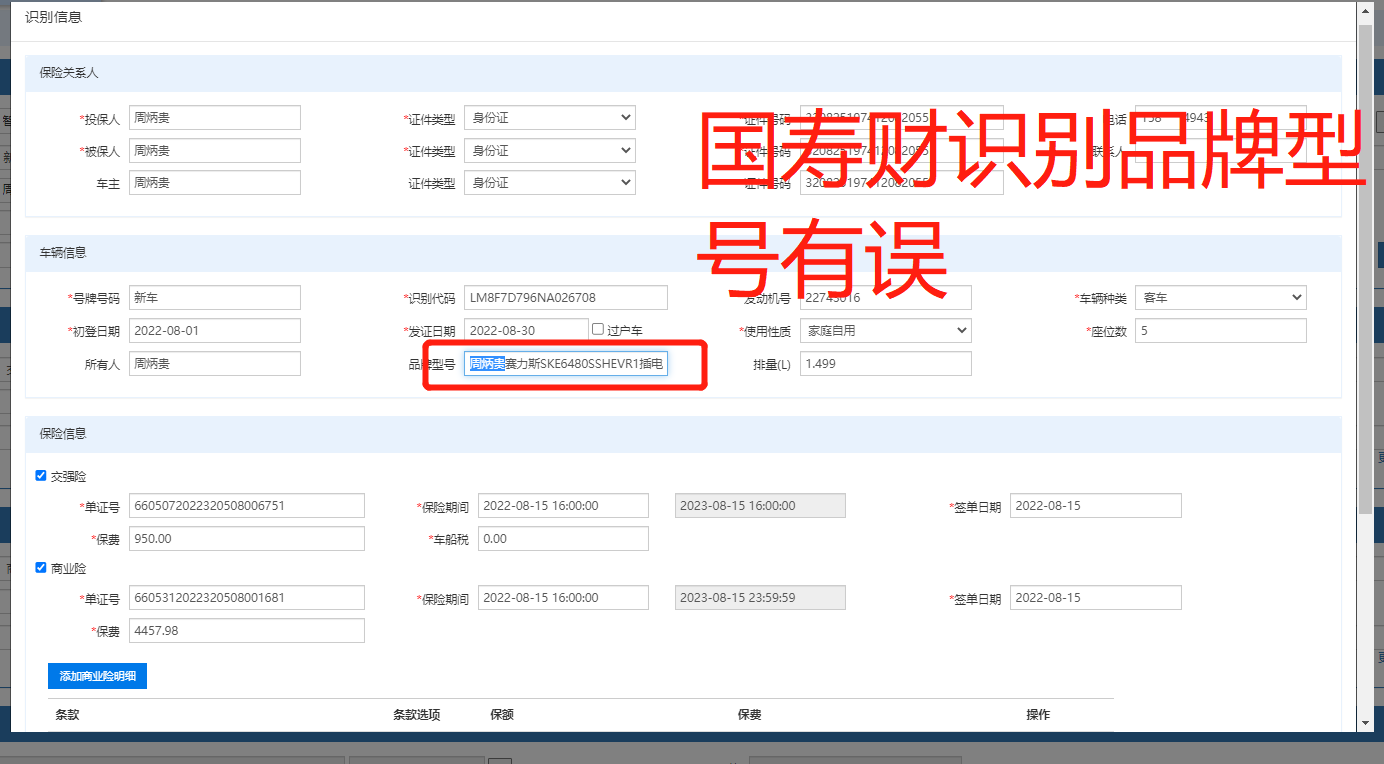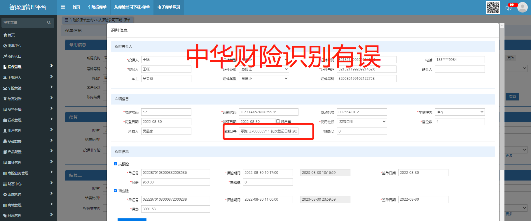 【华成】中华财险和国寿财电子识别品牌型号有误