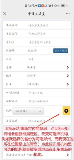 2、去掉机构后的“根据省份重新加载”,改为定位的标识,详情看附件,此标记为重新定位的意思,点此标记后机构会重新根据定位,改变可选择机构,例如我选择的省份为河南郑州,而我现在的所在位置是山东青岛,点此标识后机构里可选的机构就会被变成地点在山东青岛的