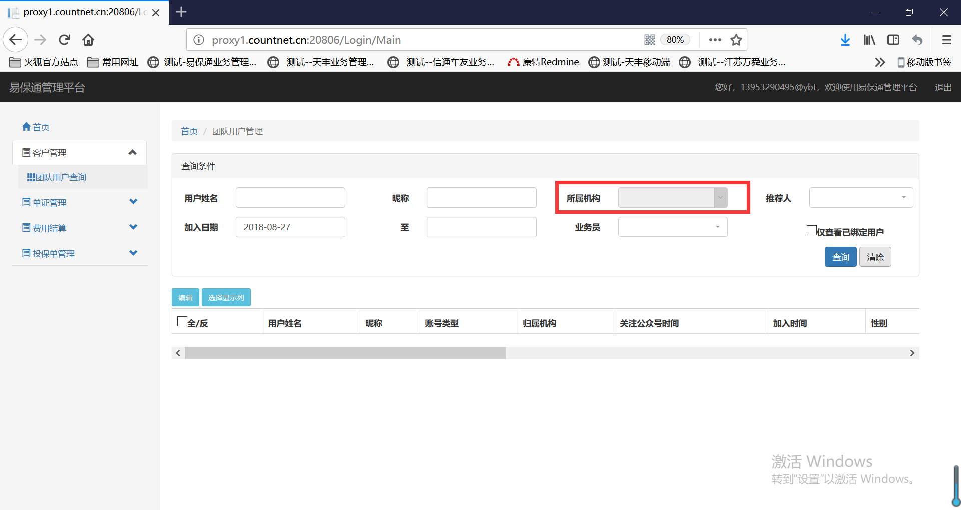 【速成高级版】团队用户查询,使用业务内勤登录,先点清除按钮,再点查询,所属机构变为空了