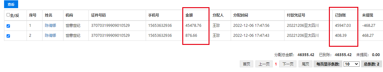 自主提现【分配管理记录】金额与已到账金额不一致(见附件)