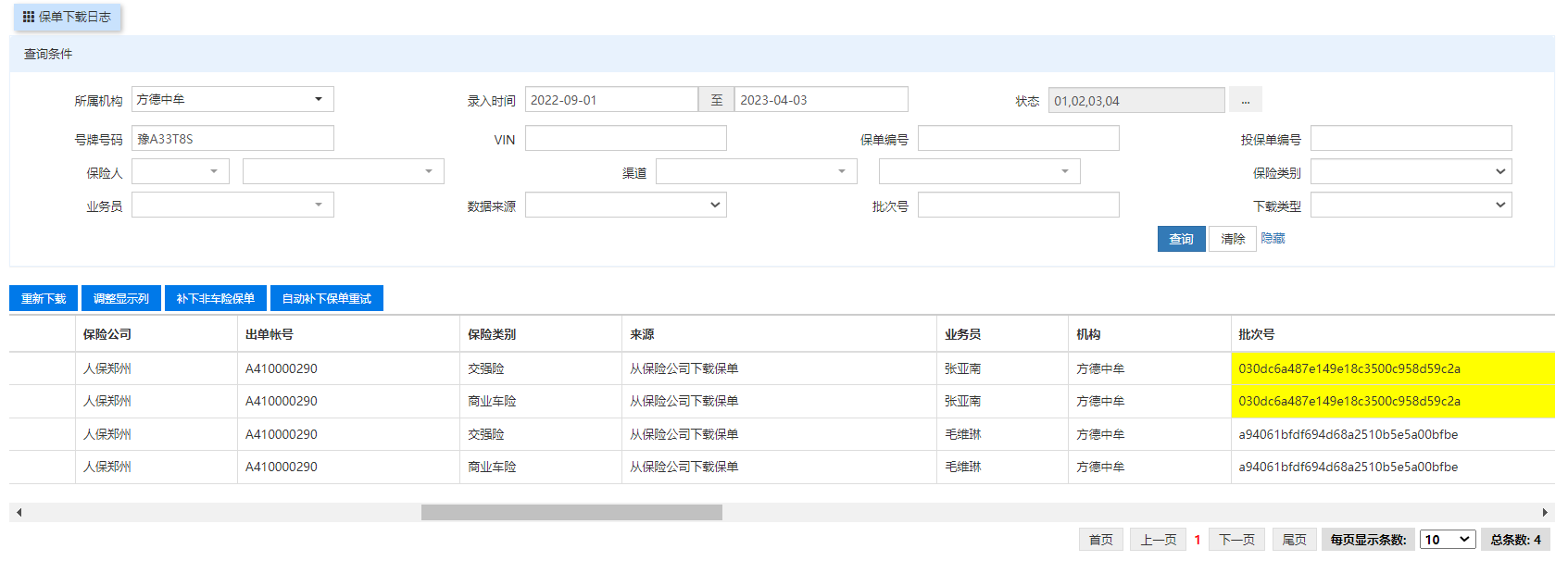 已认领的保单在微信端下载仍旧能够被下载,且下载过程中没有任何保单重复下载的提示,需修改,同一车辆不允许在PC端下载后能够再在微信端下载,数据来源进行区分,在微信端下载的来源显示为:从保险公司下载保单-微信端