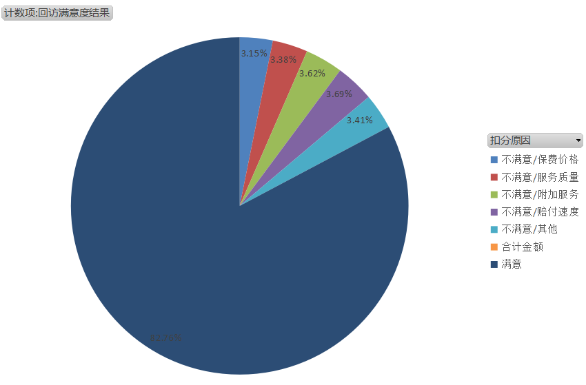 4.智能回访机器人客户不能自己提供数据的,需要系统自动生成对应时间区间的数据如图3,其中呼叫序列号为22位,通话时间随机0-5分钟以内,通话类型为呼出,回访满意度为满意或不满意,不满意则标明原因如:服务质量,保费价格,赔付速度,附加服务,其他等。根据结果生成对应的饼图,如图4,数据支持批量导出