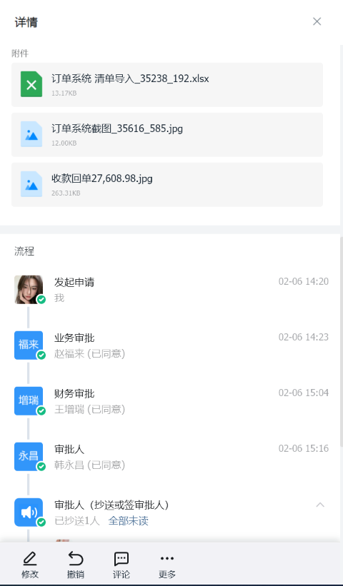当【订单类型】为【支付】时(见附件订单系统1)点击提交按钮后(见附件订单系统2)可以直接同步到钉钉,钉钉详细流程见附件