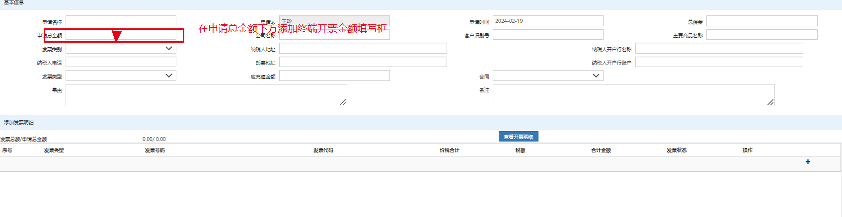 在发票管理-新添-基本信息中增加终端开票金额填写框