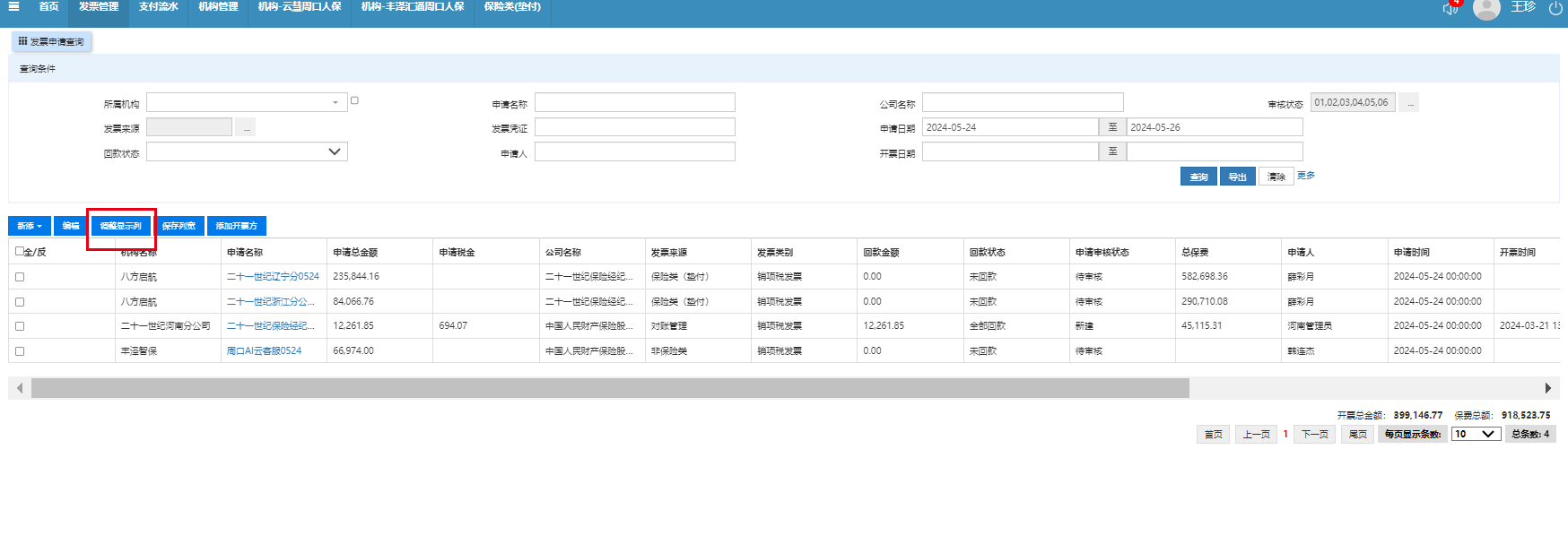 在发票管理中的调整显示列中增加终端开票金额和开票方,开票方为选拉筛选