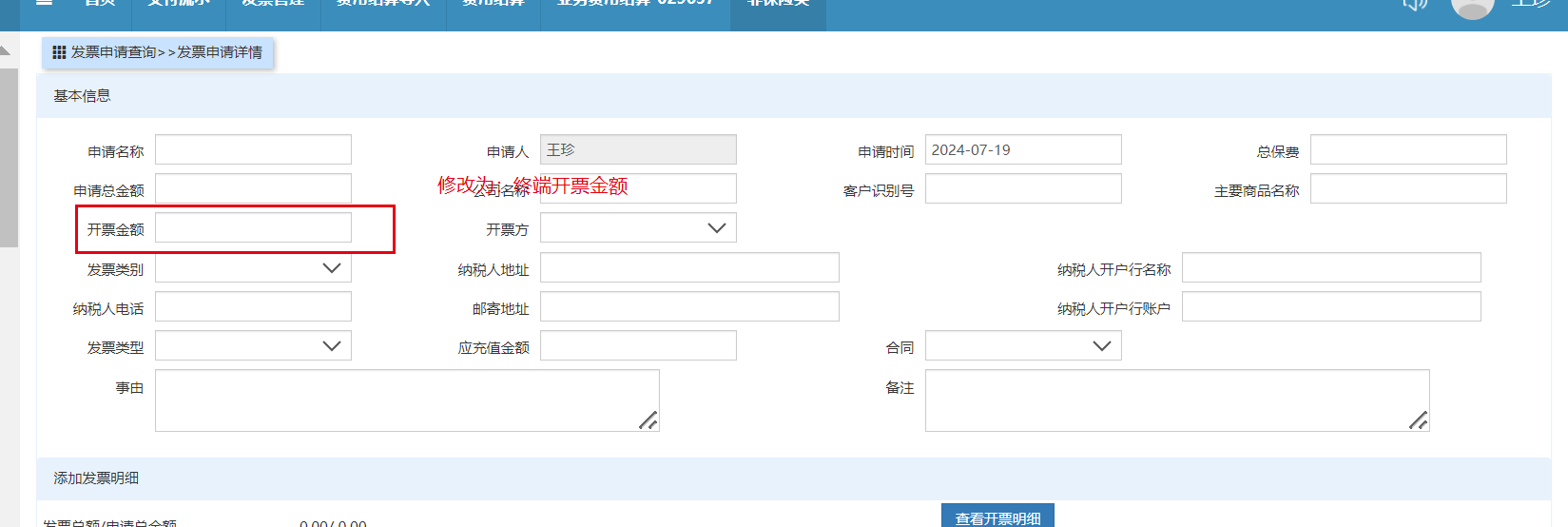 1.将发票申请详情中“开票金额”修改为“终端开票金额”,如图1所示。