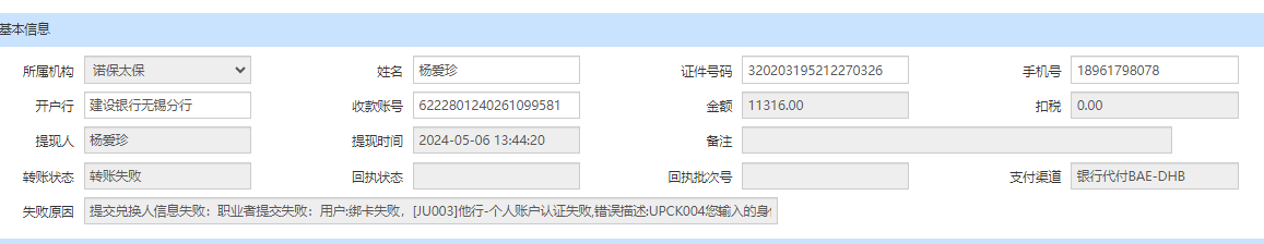 1.上述数据中,杨爱珍这个人是e管家支付接口刚上线时的旧数据,实际没有调用银行接口校验,直接返回了成功,已做兼容并发版。2.超60岁提示功能,因与其他待发版功能冲突,经与问题提出人沟通后,决定下个发版日(2024-05-09)一起上线。