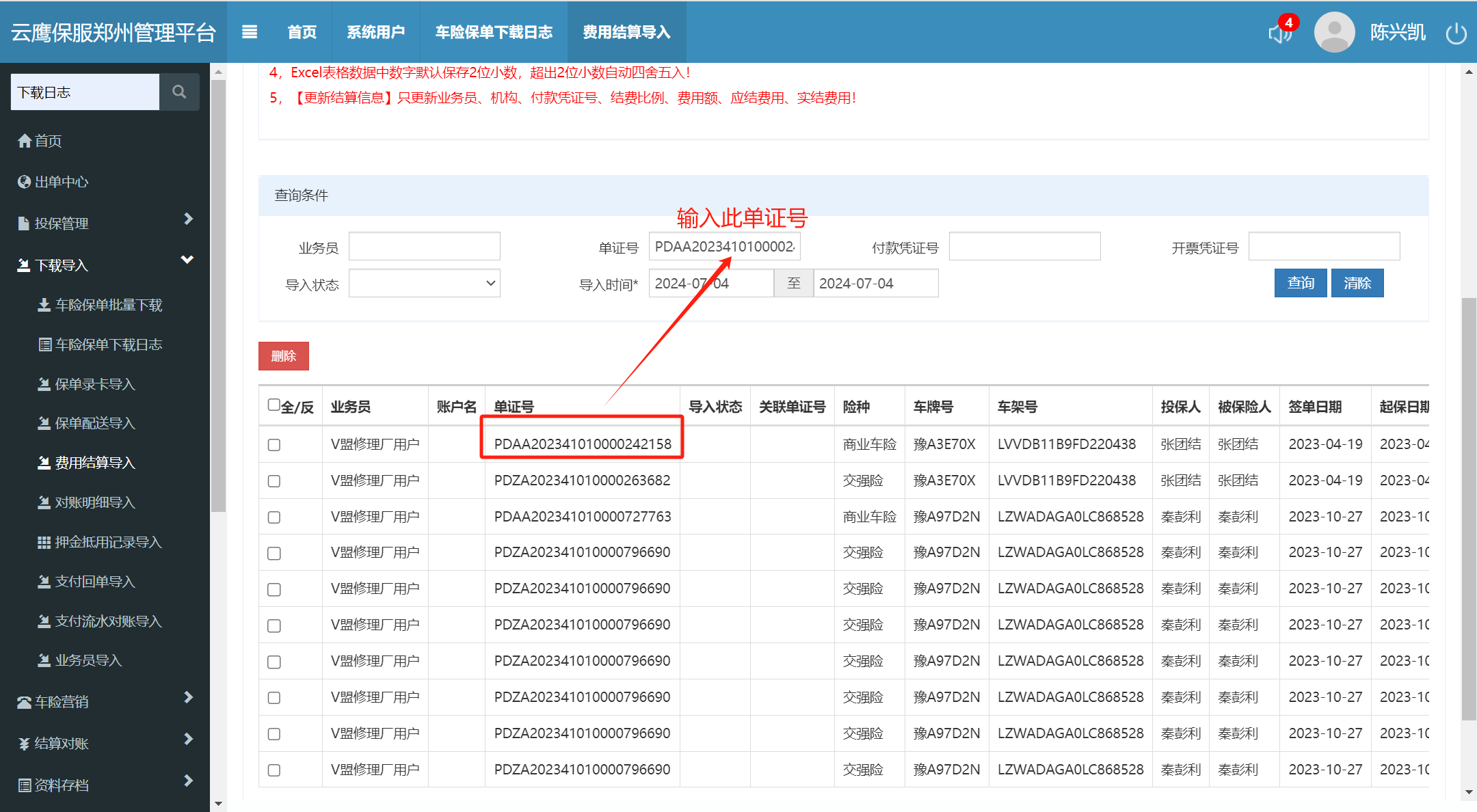 2、导入数据后输入业务员、单证号、下拉框选择状态后、输入开票凭证号和付款凭证号后搜索到的数据均为空