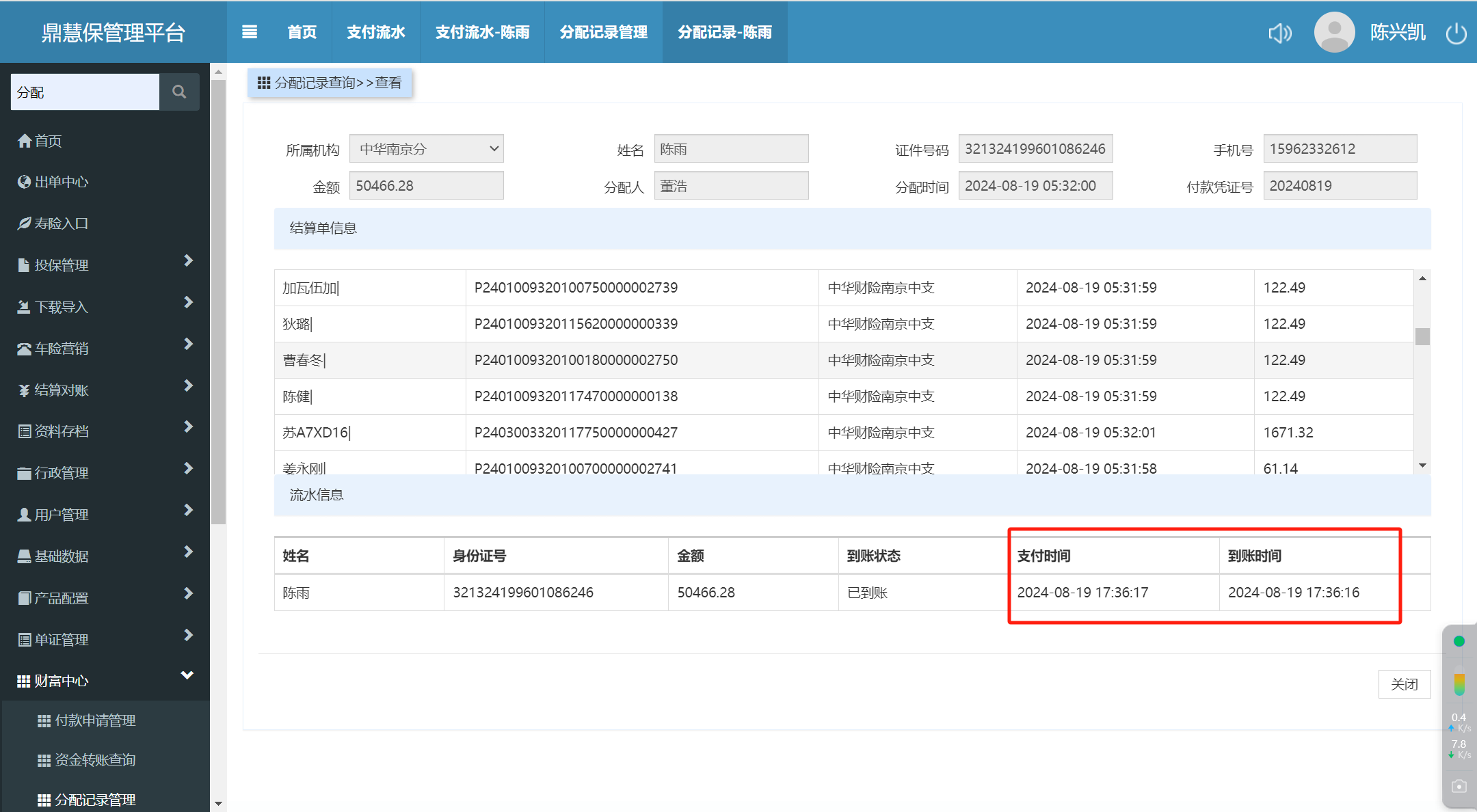 机构:中华南京分姓名:陈雨分配时间:2024-08-19付款凭证号:20240819