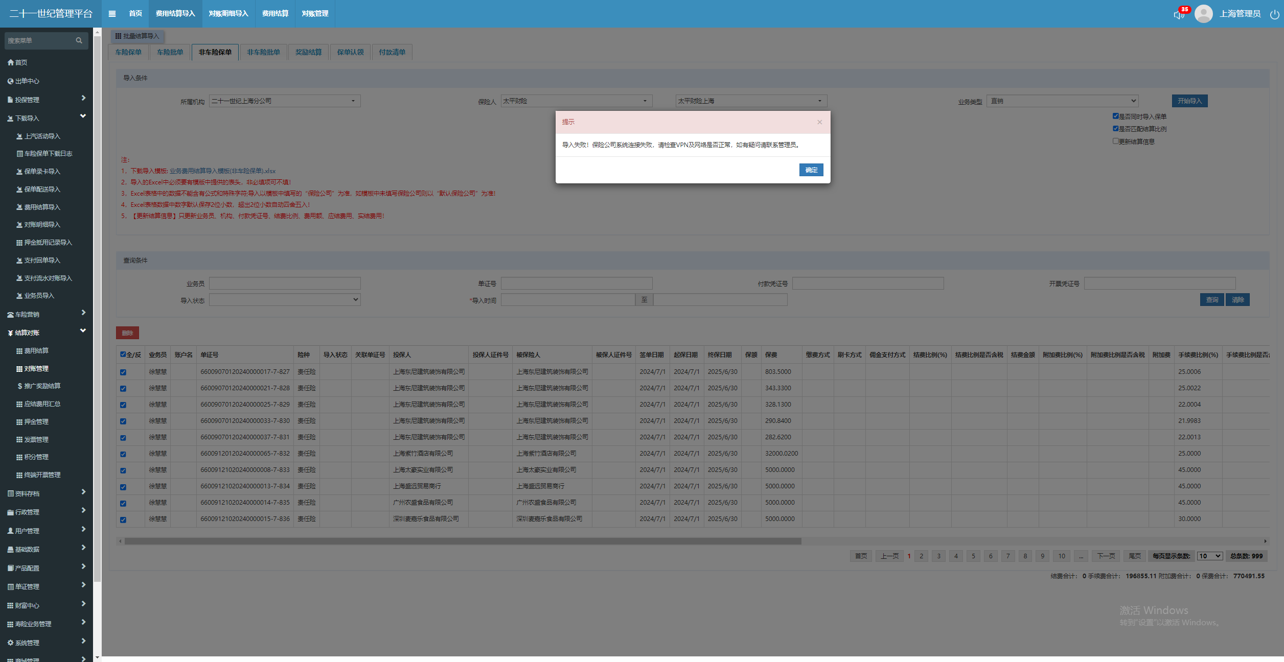 费用结算车险和非车险导入时提示连接超时,但是实际导入成功