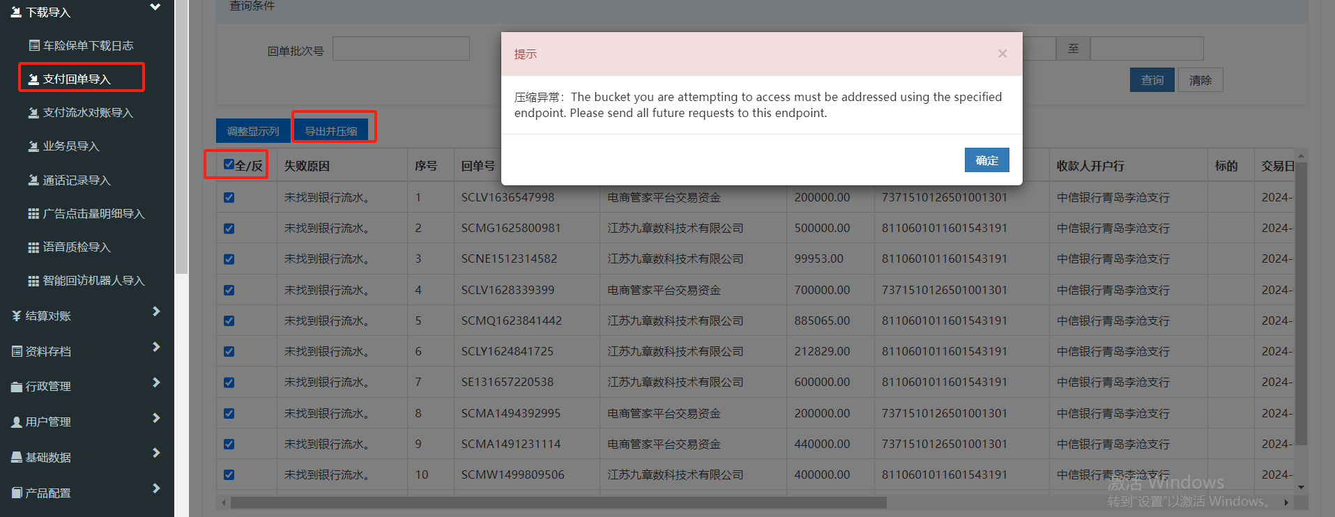 下载导入-支付回单导入中回单导出报错,在查询条件中选择回单状态和回单日期后可以查询出回单信息,然后选中要导出的回单后点击导出并压缩,显示:压缩异常:The bucket you are attempting to access must be addressed using the specified endpoint. Please send all future requests to this endpoint.的错误提示,需修复该错误,使回单能正常导出