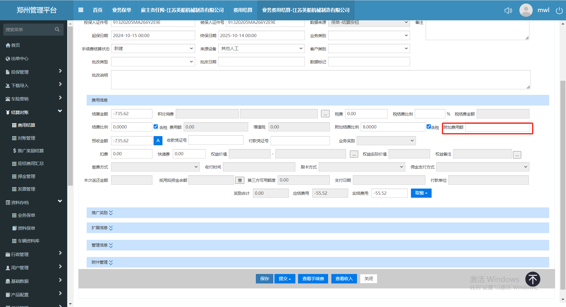 业务员老师通过新建业务保单提交结算,提交的结算单附加费用额不显示,导致结算是结算的费用不正确,需做修改