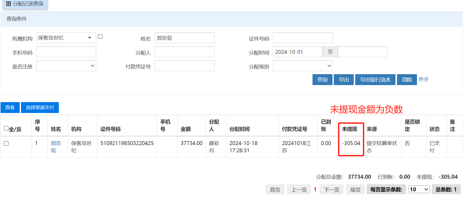 已生成分配记录,分配记录里金额为37734,但是客户提现时候页面显示可提现余额为0