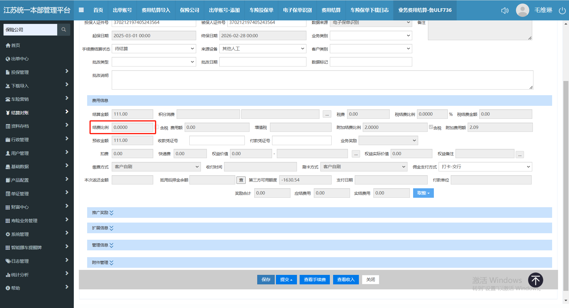 业务老师在电子保单识别时附加意外险,在结算三意外险(车意)填写结算比例和附加费比例后导入系统,从费用结算单查询时,在结算单中显示为0,没有费用额,需处理