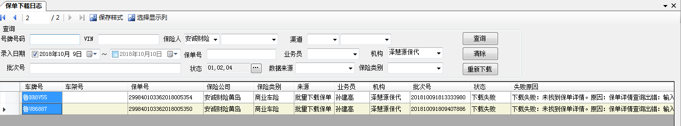 安诚财险-车险保单下载的数据下载时提示“下载失败:未找到保单详情。原因:保单详情查询出错:输入字符串的格式不正确。”