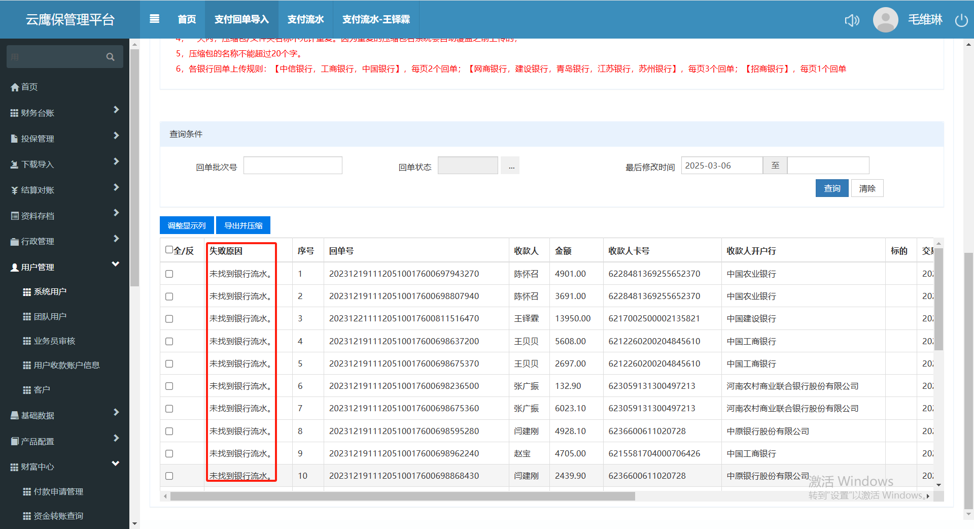 2025年3月6日上传八方网商的回单未匹配到流水,在系统中查询时有流水的,需进行处理,完成流水匹配