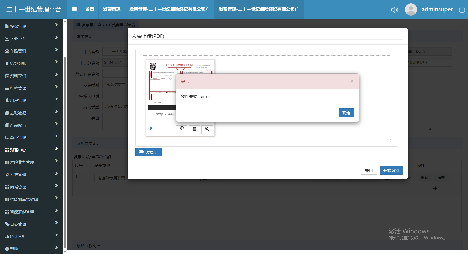 财务老师在发票管理中上传发票,无法识别,提示“操作失败:error”,需进行处理