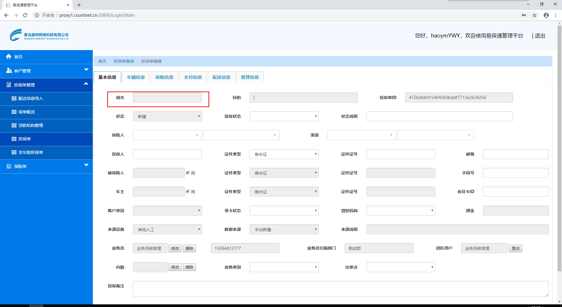 【速成高级版】投保单新添,只有业务员外勤权限的用户,新添的投保单没有城市代码账号:haoymYWY密码:123456