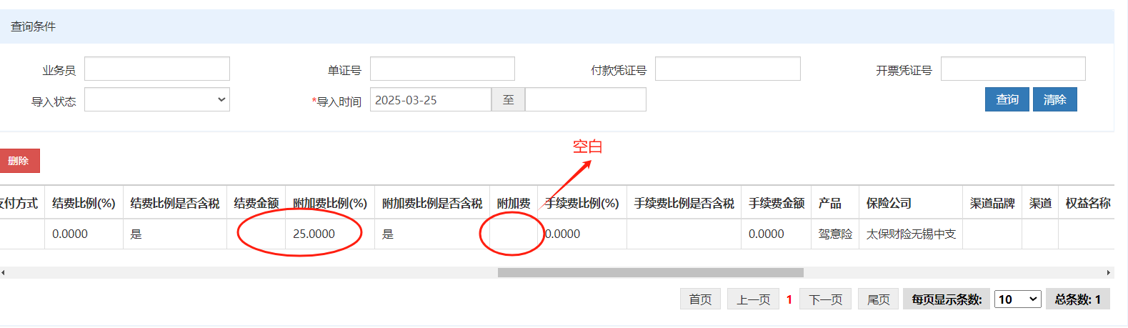 业务老师通过费用结算导入非车险,模板里填写了附加费比例及附加费,但导入系统时日志不显示附加费,需进行处理