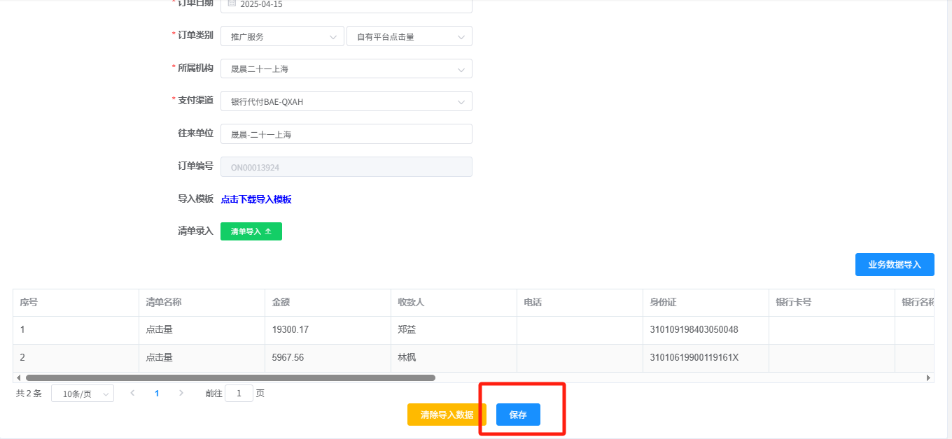 【订单录入】中【订单类型】为【支付】的【保存】按钮