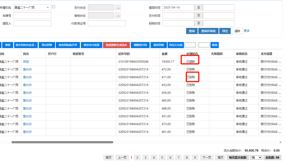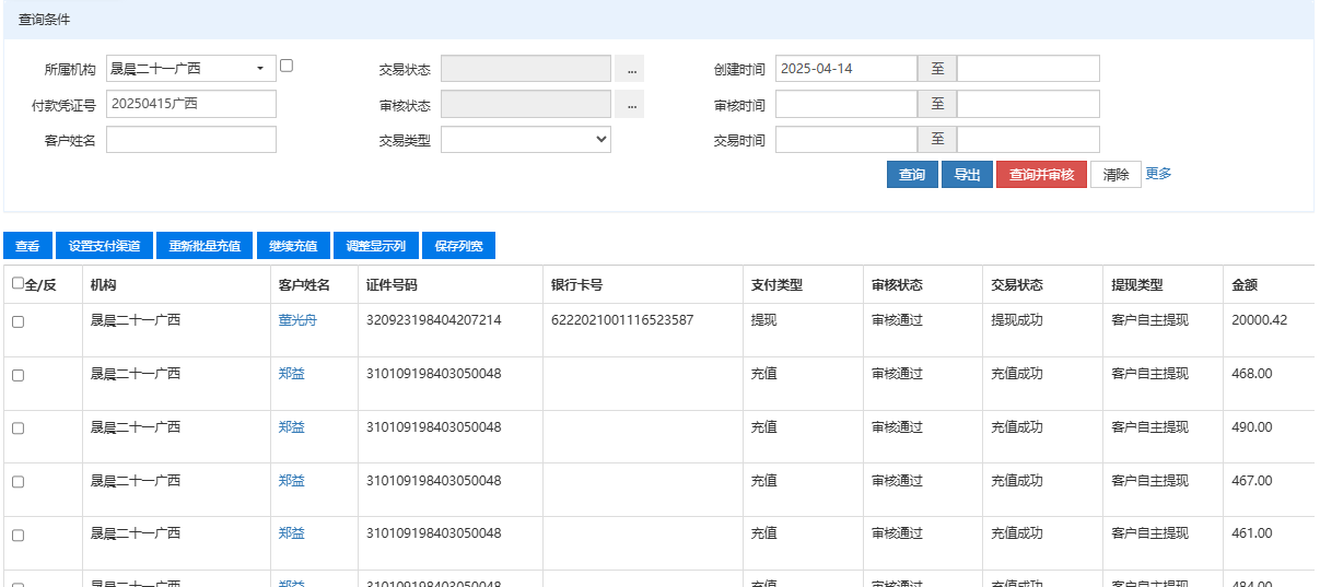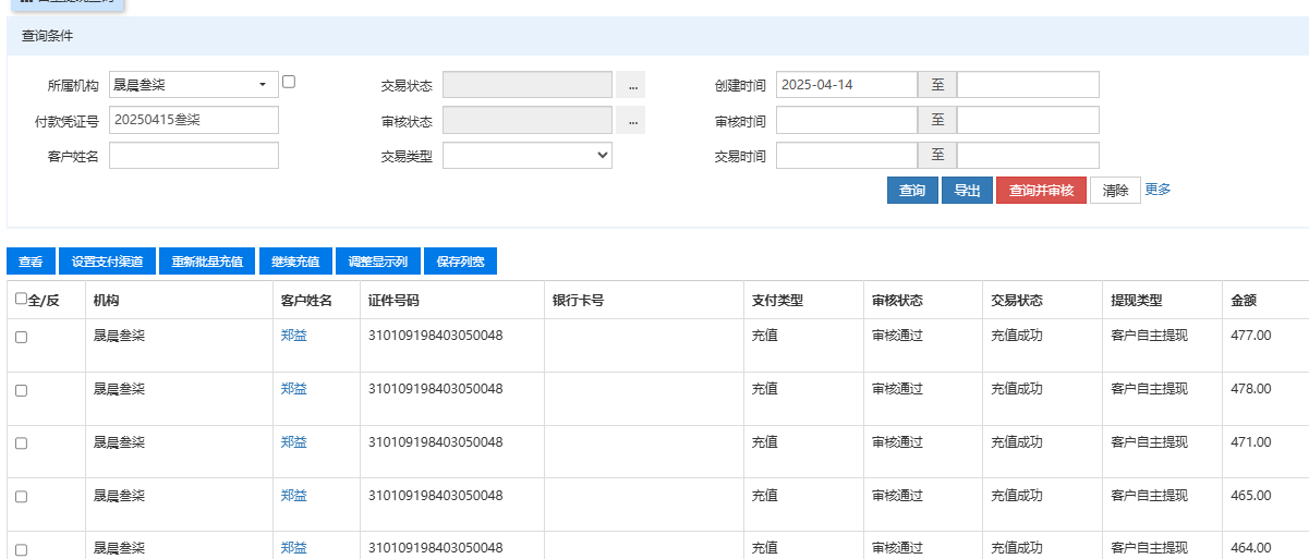 1.机构【晟晨叁柒】付款凭证号【20250415叁柒】;机构【晟晨二十一广西】付款凭证号【20250415广西】中【交易状态】都改成【充值失败已处理】或【提现失败已处理】(见附件1、2)