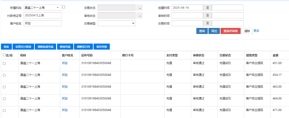 2.机构【晟晨二十一上海】付款凭证号【20250415上海】中只修改【郑益】的【交易状态】都改成【充值失败已处理】(见附件3)