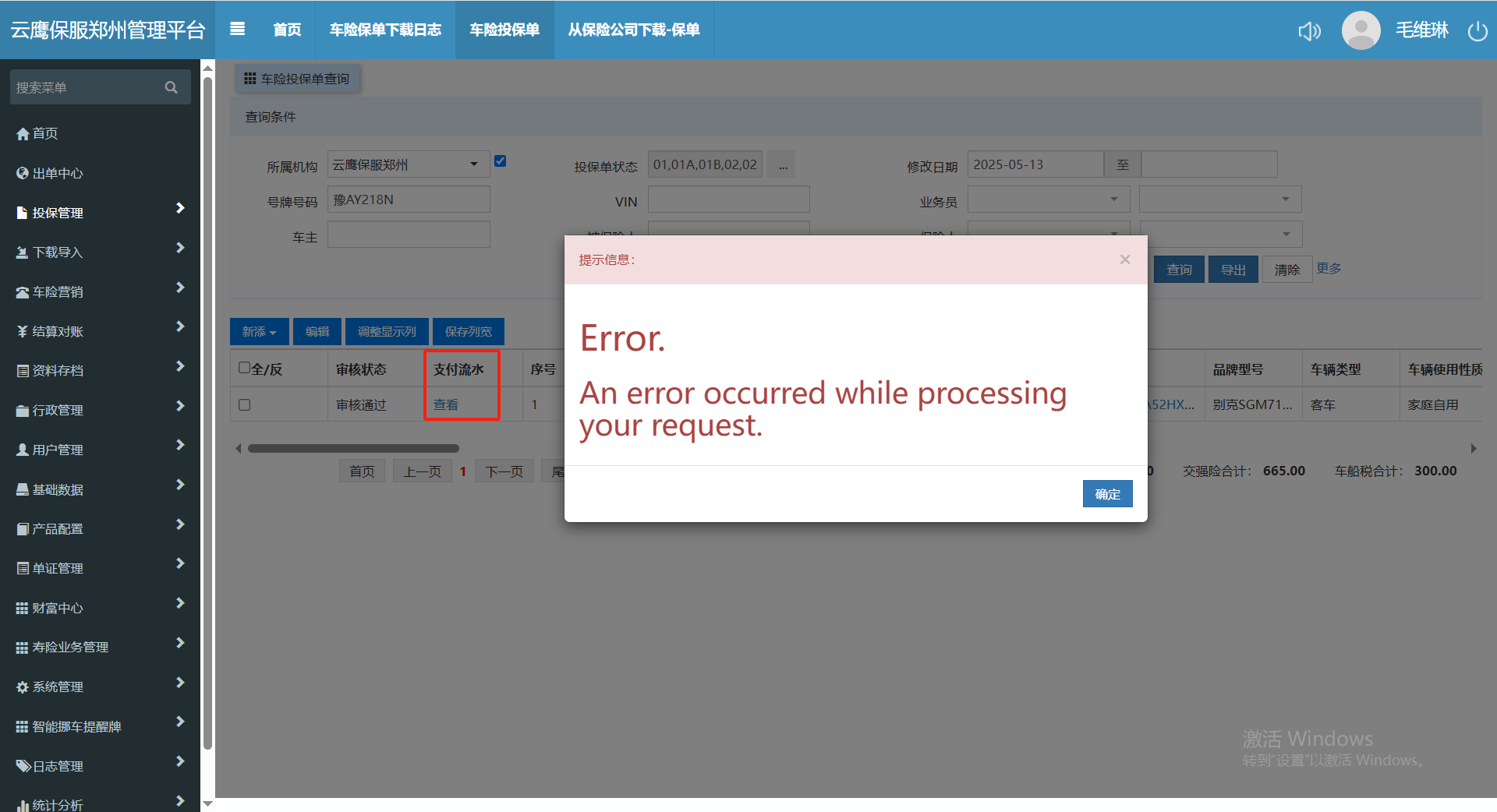 投保管理-车险投保单中支付流水查看报错,无法查看流水生成情况。