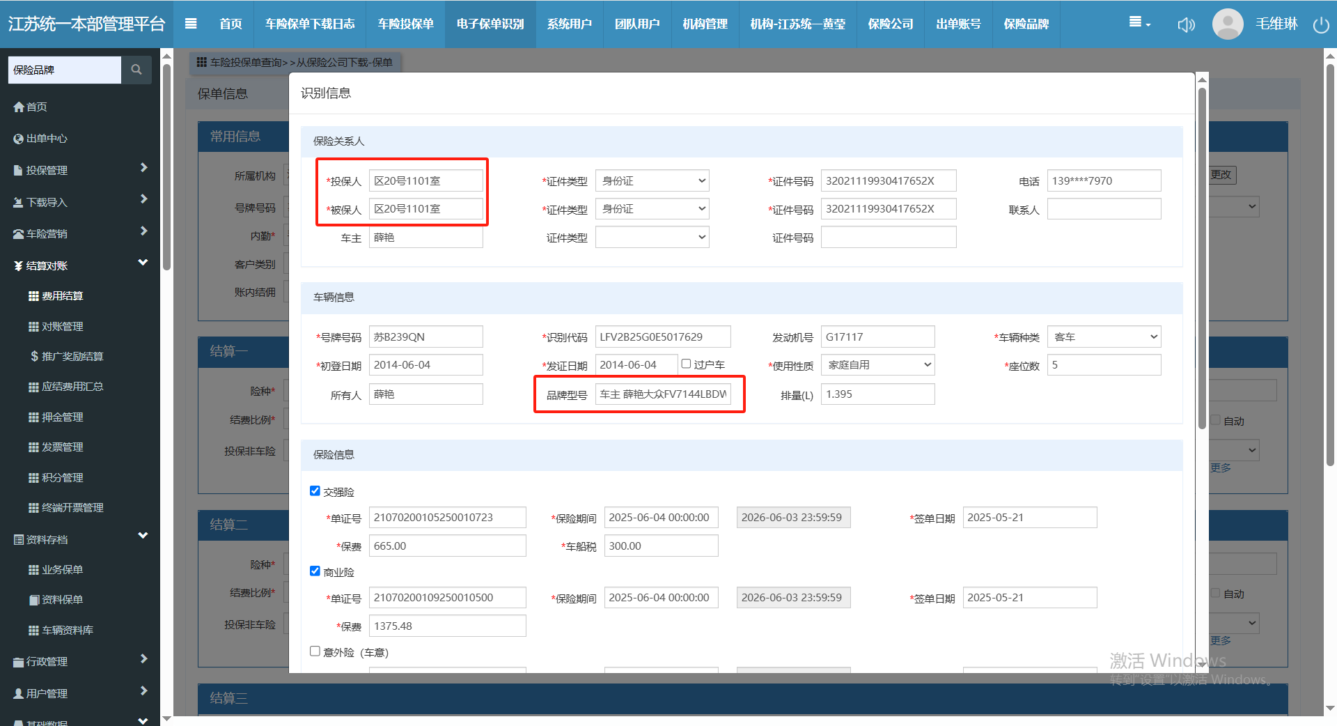 电子保单识别投保人、被保人姓名识别错误,品牌型号多识别了车主姓名,需进行对应