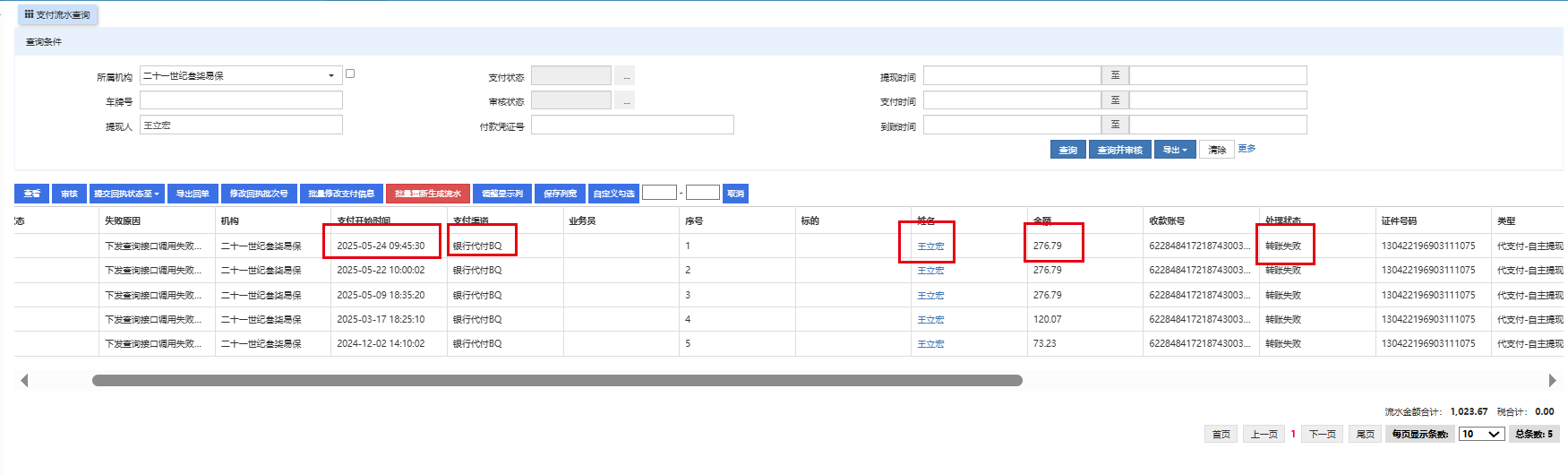 机构:二十一世纪叁柒易保 支付渠道:银行代付BQ 支付时间:2025.5.24 收款:王立宏 支付金额:276.79的流水;银行有支付记录,但是系统显示转账失败 审核不通过,需查明原因,修改系统数据。