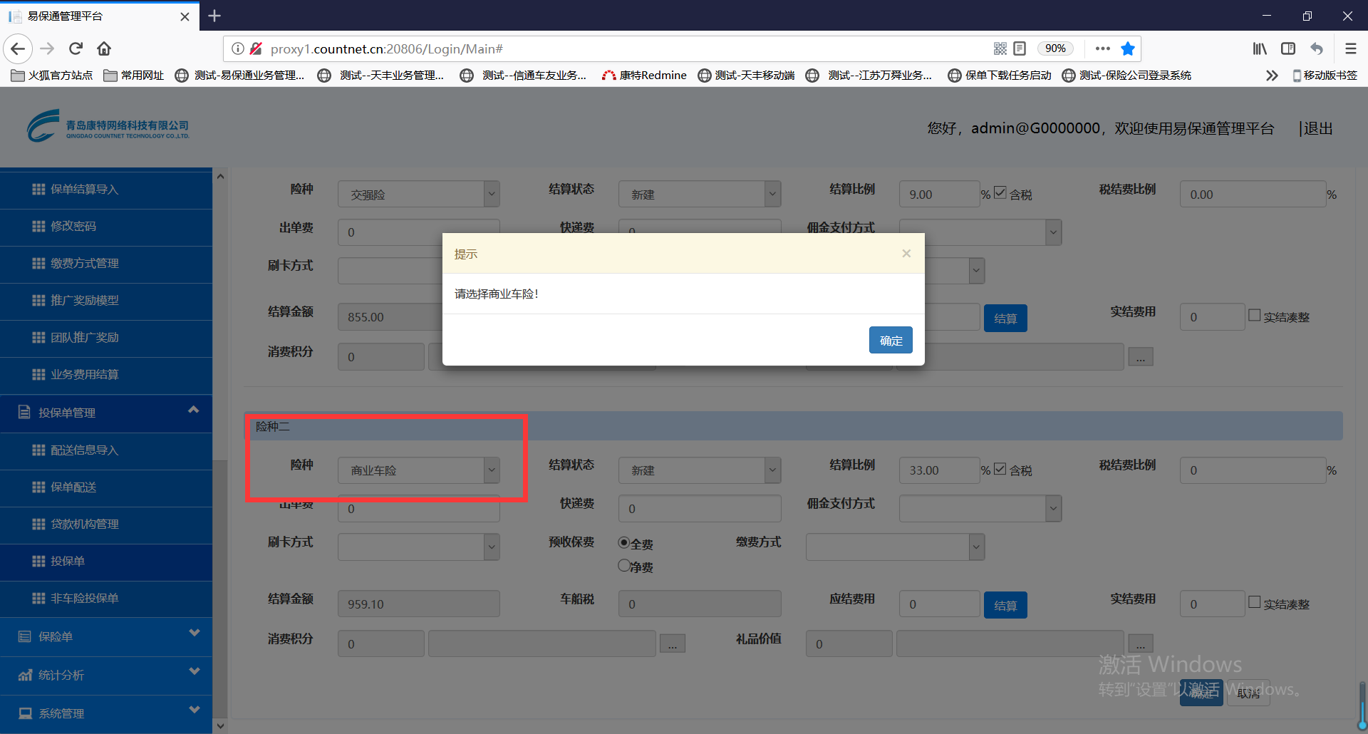 【速成高级版】快速结算,险种二切换别的险种,再选择商业险种时,仍然会提示请选择商业险