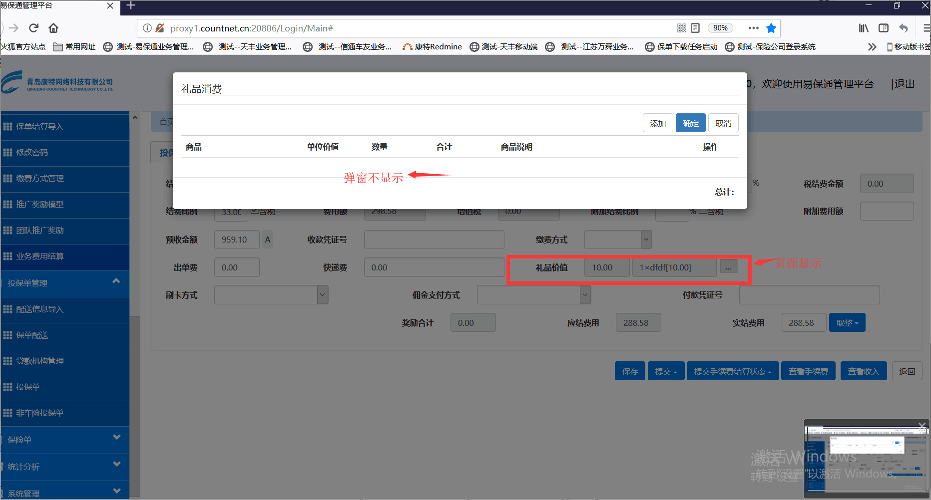 3. 投保单有礼品价值,快速结算页面,商业险的礼品价值页面显示有数据,但是弹窗无数据。结算商业险时,结算单内也有此问题.见附图