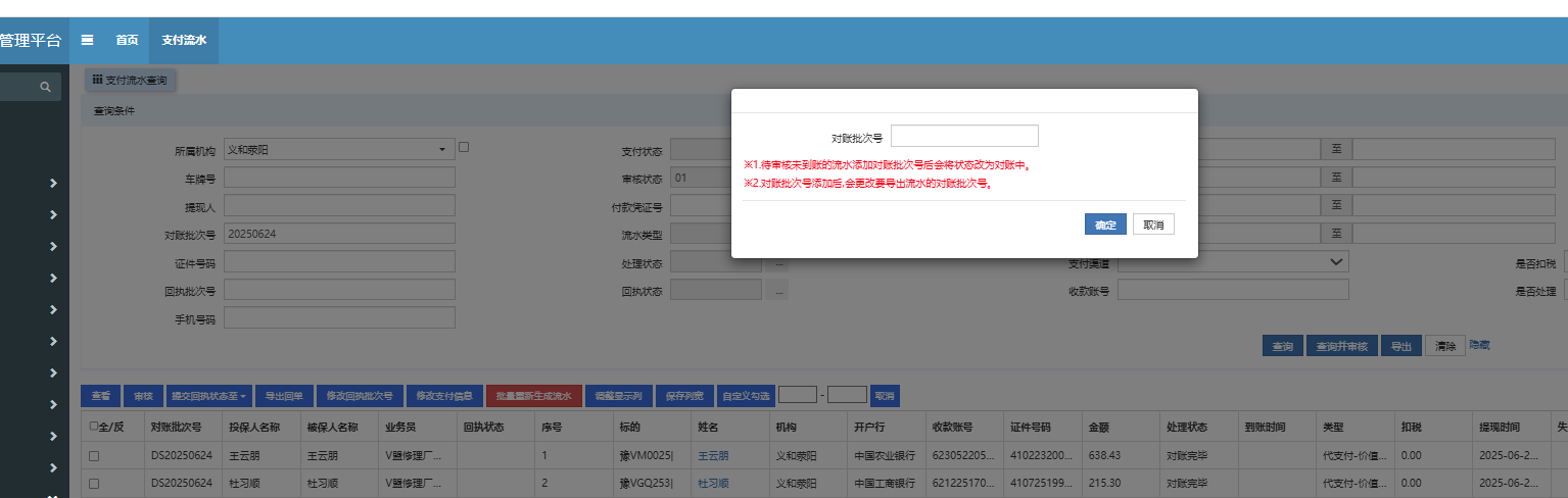 导出流水时,不需要输入对账批次号,直接导出,更改对账批次号只能通过对账来修改