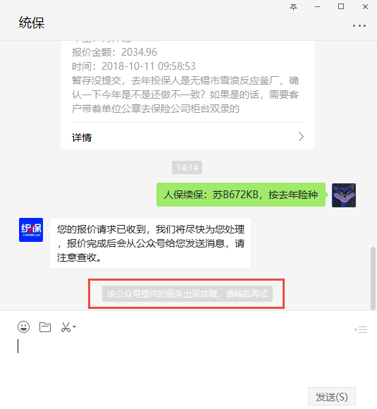 向江苏统一公众号(统保)发送消息会有“该公众号出现的服务出现故障,请稍后再试”的提示,影响体验。