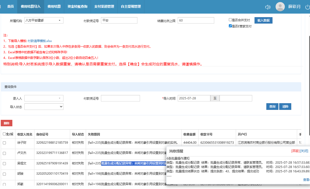 【付款清单】导入提示错误:批量生成分配记录异常:未将对象引用设置到对象的实例(见附件)