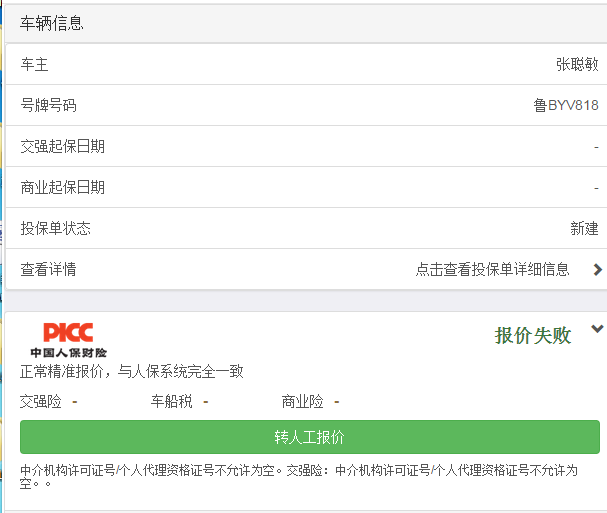 【青岛融安】报价时提示“中介机构许可证号/个人代理资格证号不允许为空。交强险:中介机构许可证号/个人代理资格证号不允许为空。。”