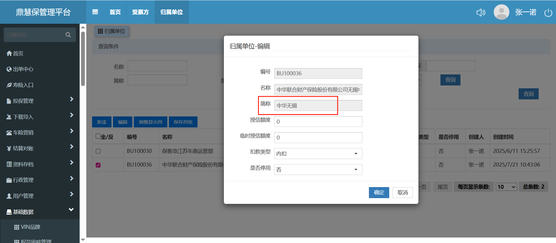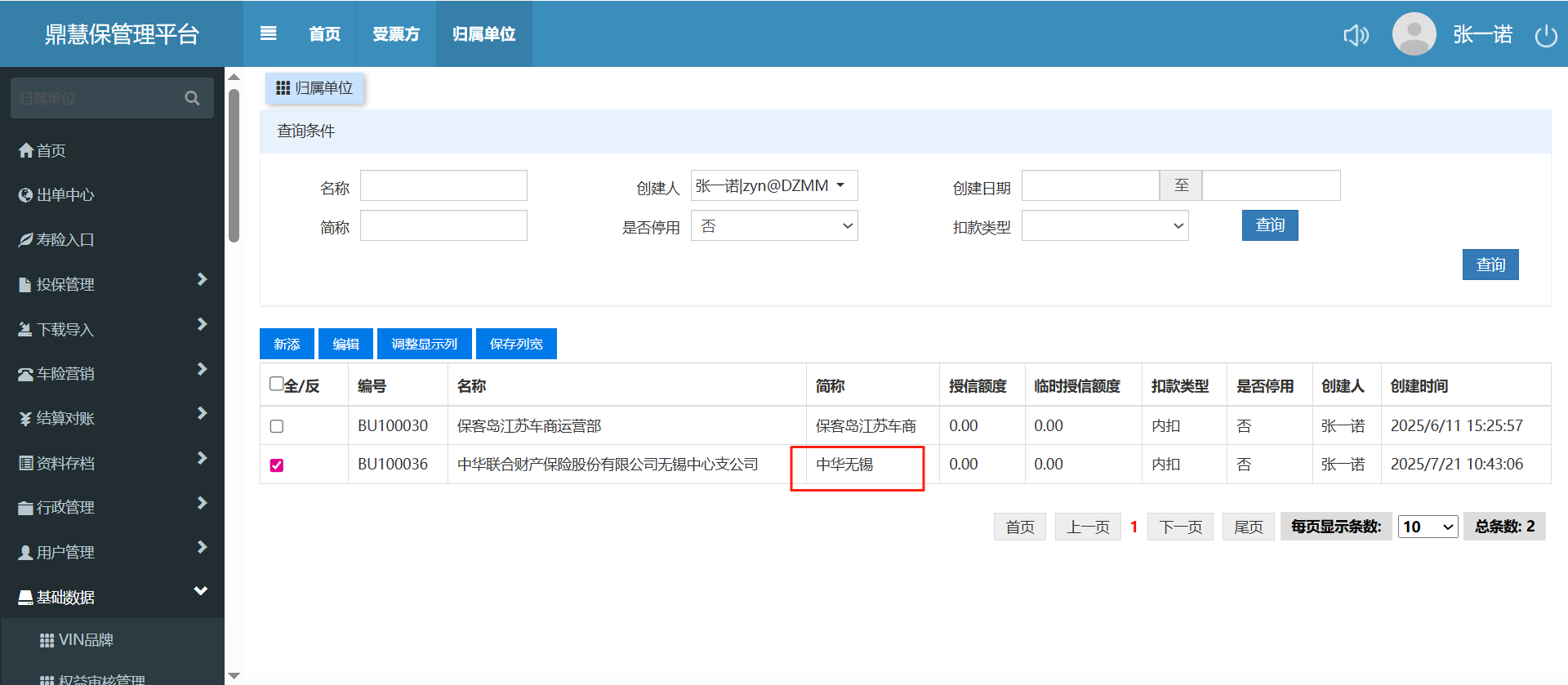 【鼎慧保管理平台】归属单位简称中华无锡需要修改为中华财险无锡中支