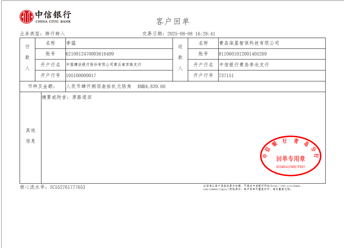 郑州服务器 “方德中牟”机构 豫A50J52 PDZA202541010000504037 金额:4839.60,原路退回,需要修改转账失败状态。需要备注:手动修改转账失败,8.8原路退回
